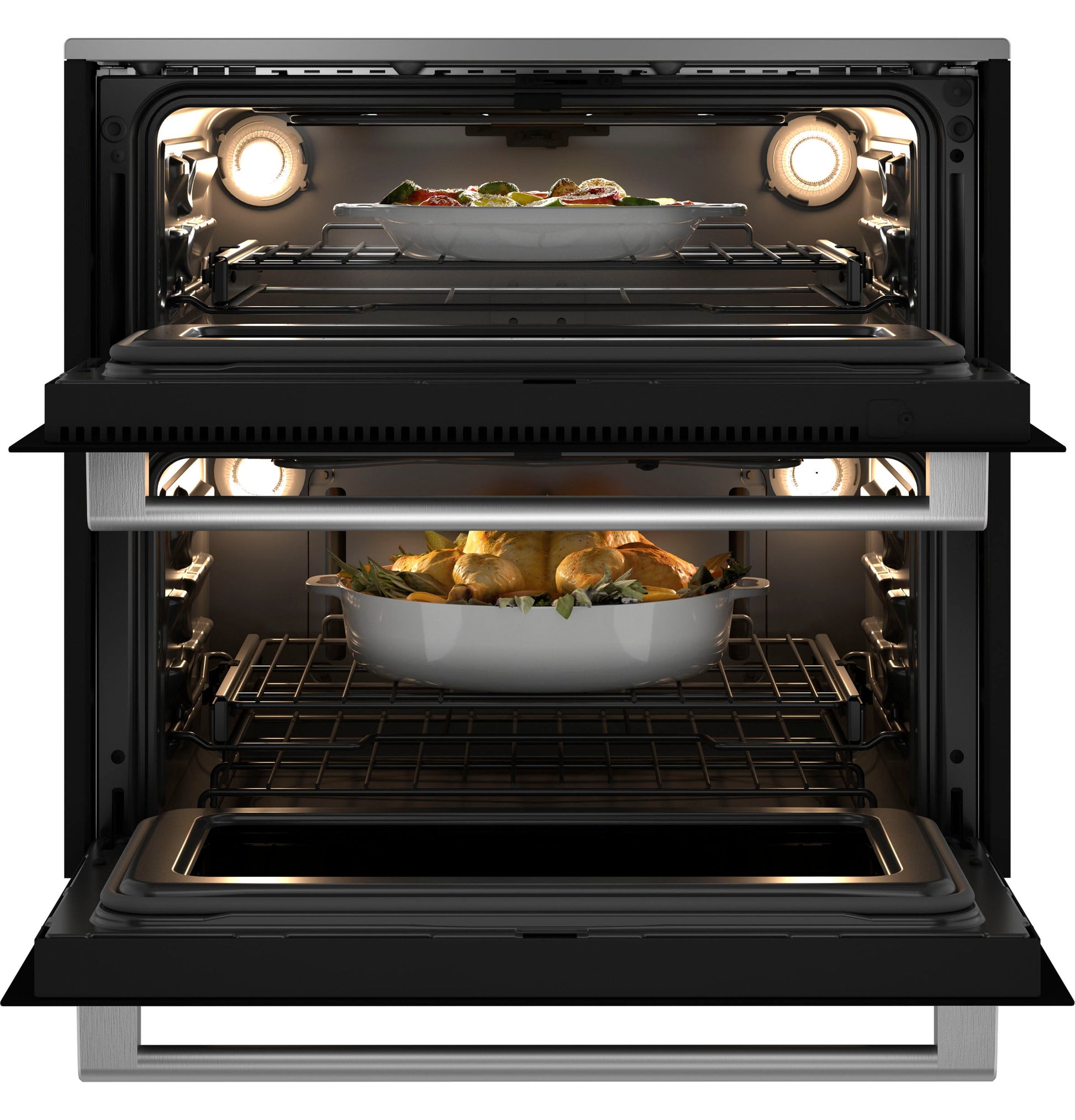 WiFi Connect Built-In Oven Cooking Modes Convection Bake, Convection Bake Multi-Rack, Convection Roast, No Preheat Air Fry, Precision Cooking Modes, Thermal Bake, Thermal Broil, Turkey Mode Fuel Type Electric Product Type Single/Double Oven Oven Interior 2 Halogen Interior Oven Lights (Both Ovens), Black Gloss Finish, Hidden Bake Cooking Technology Traditional Upper; Convection Lower Oven Features 6-Pass Dual Broil Element (Upper), 8-Pass Bake Element (Both Ovens), 8-Pass Dual Broil Element (Lower), Closed Door Broiling Cleaning Time Variable with Delay Clean Option Configuration Double Oven Oven Control Features 12-Hour Shut-Off Capability, Audible Preheat Signal, Auto Recipe Conversion, Certified Sabbath Mode, Control Lock Capability, Cook Time, C° or F° Programmable, Delay Time, Electronic Clock & Kitchen Timer, Mis-Wire Detection, Proof Mode, Remote Enabled, Scan-to-cook, Temperature Probe, Warm Mode Sabbath Mode Yes Oven Rack Features 1 Self-Clean Heavy-Duty Offset Oven Rack, 2 Embossed Rack Positions (Upper), 2 Self-Clean Roller Racks, 3 Embossed Rack Positions (Lower) Self-Clean Oven Door Lock Automatic Cooking System True European Convection with Precise Air (Lower) Control Type 7" Full-Color Touch LCD Screen Connected Capabilities Amazon Alexa, Fresco, IFTTT, Innit, Sonos, The Google Assistant OU Certified No Oven Cleaning Type Self-Clean with Steam Clean Option APPEARANCE