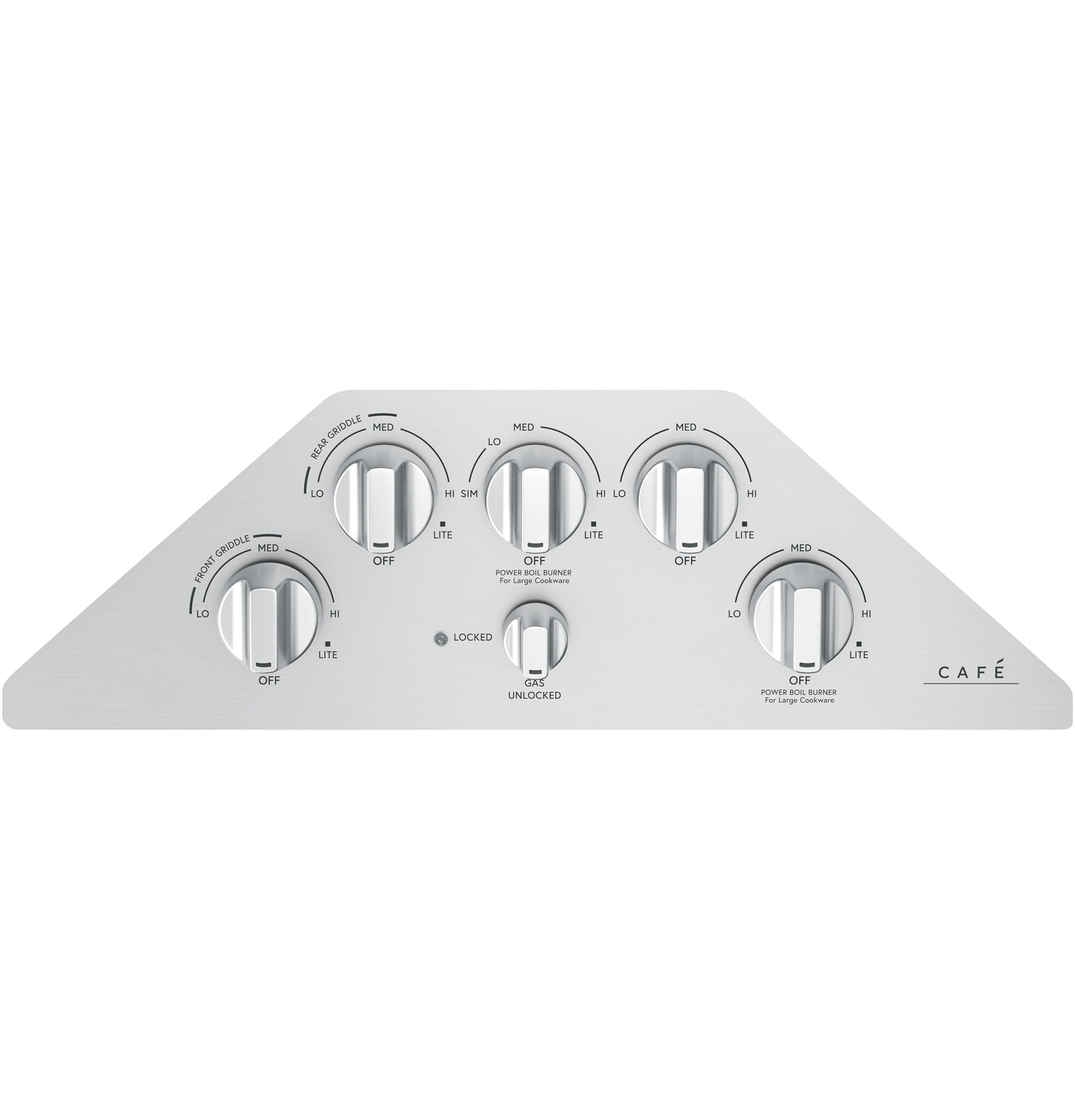 Cooktop Burner Type 5 Sealed Valves (Degree of Turn) 270 Burner - Right Rear 5,000 BTU Burner - Right Front 15,000 BTU Power Boil Fuel Type Natural Gas (factory set) Control Location Front Center Cooktop Type Continuous Grates with Griddle Ignition System Electronic Burner - Center 20,000 BTU Tri-ring Power Boil Cooktop Surface Cooktop Control Features Child Lock Burner - Left Rear 9,500 BTU Control Type Knob Cooktop Burner Grate Material Heavy Cast Cooktop Burner Grate Features Continuous Grates, Dishwasher Safe, Edge-to-Edge Grates Griddle Cast Iron, Included Configuration 5 Sealed Cooktop Burners Burner - Left Front 9,500 BTU Product Type Cooktop IsARViewEnabled TRUE APPEARANCE