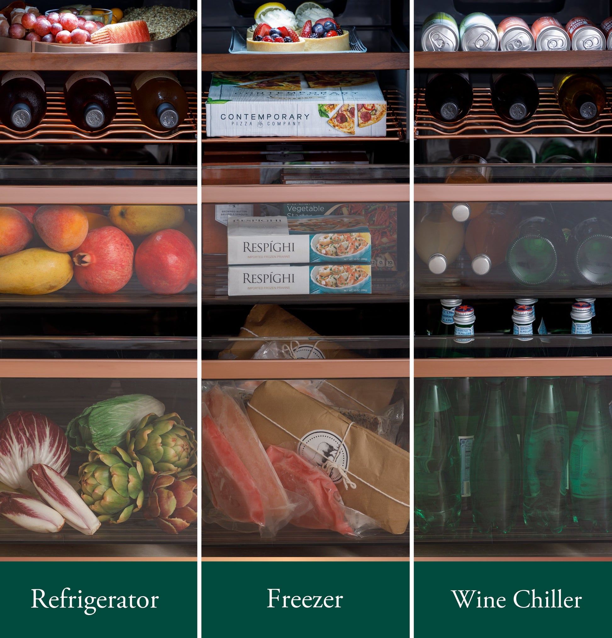 Temperature Management Features Multiflow Air System Control Type Electronic Temperature Controls Dispenser Features Door Alarm, Dual-Dispense AutoFill Pitcher, Water Filter Indicator Light Icemaker Factory-Installed Number of Doors 4 WiFi Connect Built-In Performance Features Deluxe Quiet Design, Easily Removable Door Gaskets, Triple Evaporator Cooling Sabbath Mode Yes Filter Location Left door Freezer Storage Baskets 1 Beverage Rack, 4 Slide-Out Bins (2 Deep Bulk Storage), 6 Total Temperature Management System Triple Evaporator Connected Capabilities DSM Capable, IFTTT Freezer Door Bins 1 Fixed, 2 Tilt Out, 3 Adjustable, 6 Total Defrost Type Frost Guard Fresh Food Door Features Dairy Compartment, Door Alarm, In Door Autofill Pitcher Leveling System 2 Point Front Adjustable Fresh Food Cabinet Shelves 1 Quick Space Shelf, 4 Glass Split Mobility Rollers Yes Fresh Food Door Bins 2 Adjustable, 3 with Gallon Storage, 6 Total Standard Zone Quad Door 3 Door Bins (1 Fixed, 1 Short Tilt-Out and 1 Tall Tilt-Out), Bottom Left, Electronic Temp Control, Freezer: -6 to 5 (Recommended 0), LED Lighting, Two 9" Drawers and One 11" Deep Drawer Freezer Features 1 Convertible Compartment, LED Lighting Exterior Style Counter-Depth Configuration French Door, Quad Door Refrigerant Type R600a Dispenser Internal Water Fresh Food Features Fresh Food Cabinet Drawers 1 Sealed High Humidity, 1 Sealed Low Humidity Water Filtration GE Water Filtration 6 Month, Water Filter Indicator Light, XWFE Freezer Storage 1 Fixed Door Bin, 2 Tilt-Out Door Bins, 3 Adjustable Door Bins, One Slide Out Wine/Pizza Rack, Three 9" Deep Bins, Two 11" Deep Bulk Bins Product Type 4-Door Refrigerator, Bottom Freezer Refrigerator, French-Door Refrigerator OU Certified OU/CRC Enhanced Shabbos Mode, when used with Shabbos Keeper, sold separately Select Zone Quad Door 3 Adjustable Bins, 3 Temperature Modes (Freezer, Refrigerator, Chiller), 9" and 11" Deep Drawers, Bottom Right, Chiller: 41 to 43 (Recommend 42), Electronic Temperature Control, Freezer: -6 to 5 (Recommend 0), Full Convertible Zone, LED Lighting, Refrigerator: 34 to 40 (Recommend 37), Slide Out Pizza/Bottle Rack APPEARANCE