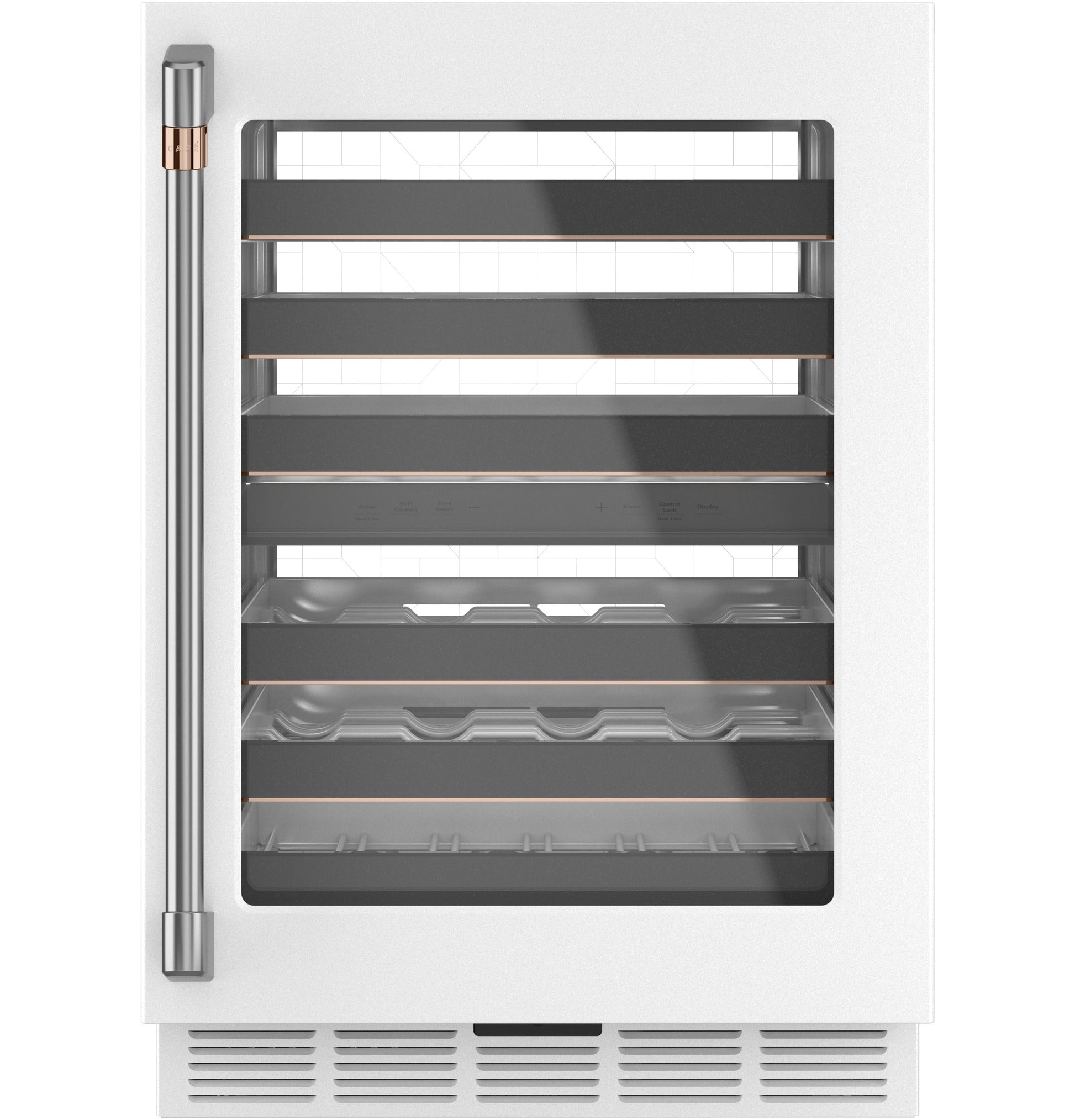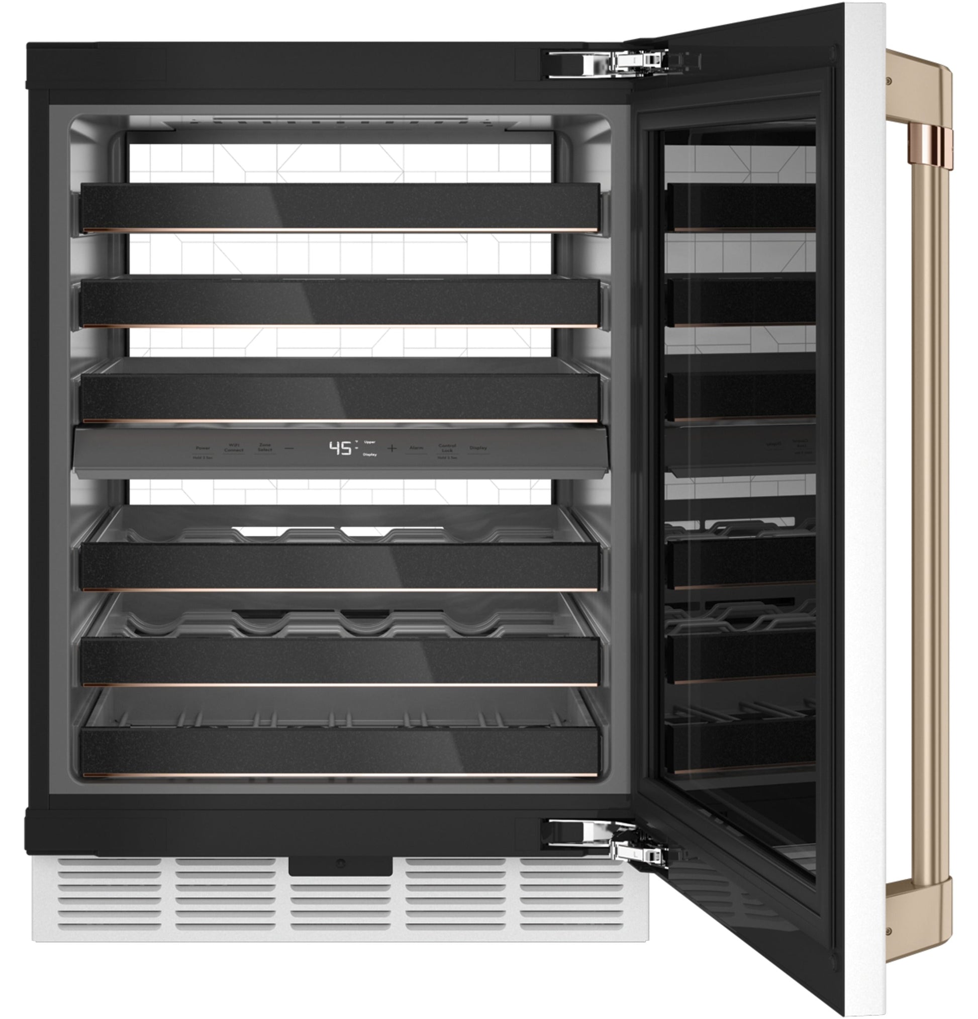 Dual Temp Zone Yes - Independent Upper & Lower Zones Hi Temp Alarm Yes, Audible & Visual Large Wine Bottle Capability Yes, Top Rack in Both Upper and Lower Zones Sabbath Mode Yes Choose Temp Zones Yes, Upper & Lower Zones Wine Racks 6 Full-Extension, with Matte Black Fronts and Copper Accents Refrigerant Type R600a Temperature Range 41 - 61 F Interior Lighting Control Door Closed: On/Off Option, Door Open: Always On Product Type Wine Reserve Leveling System Leveling Legs Defrost Type Auto Triple Pane Glass Door Yes WiFi Connect Built-In Proximity Lighting Control Yes - On/Off Option, Multi Key or in App Door Ajar Alarm Yes, Audible & Visual Interior Lighting LED/ LED Light Wall Adjustable Temperature Control Yes Control Type Electronic OU Certified No APPEARANCE