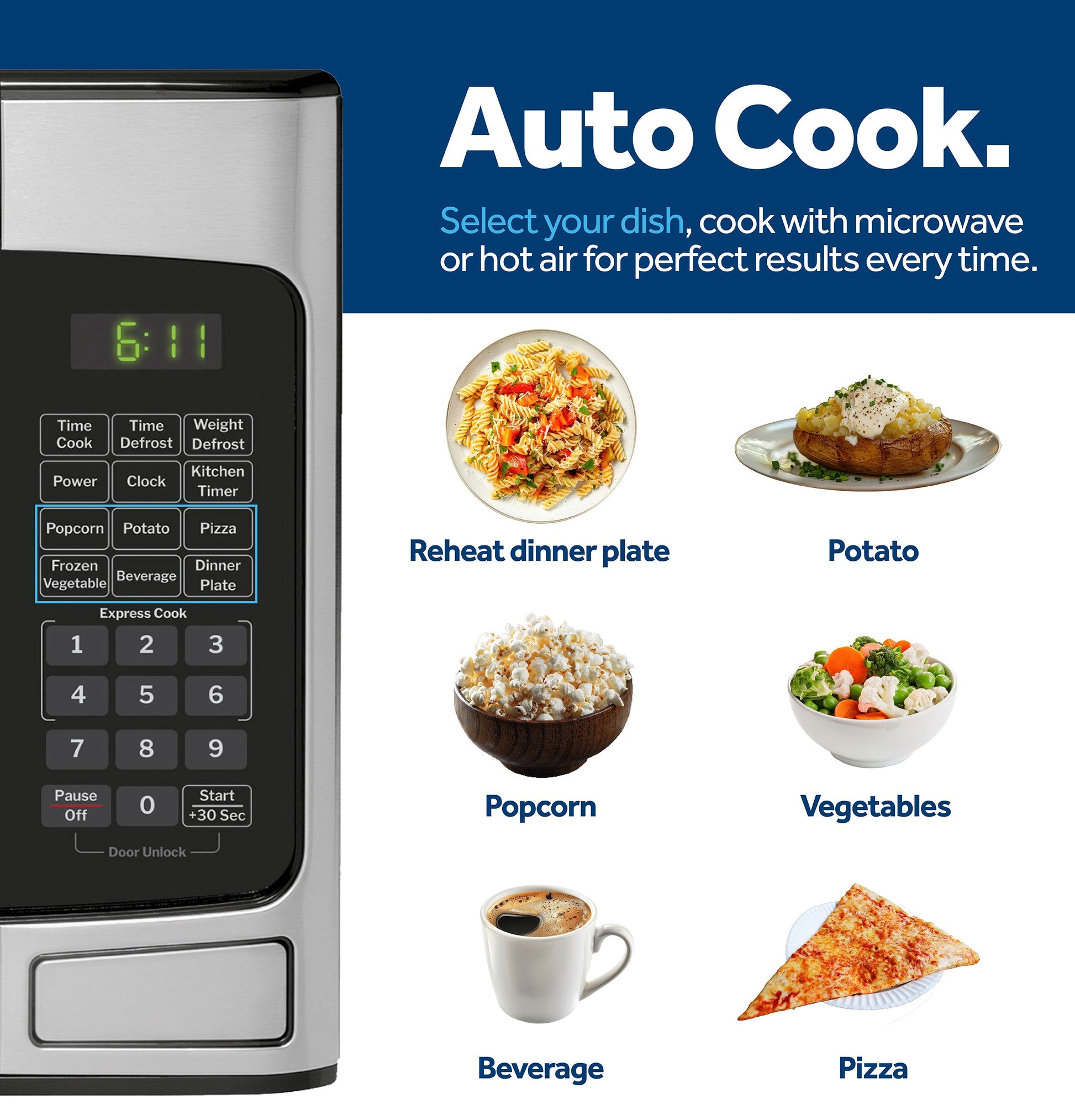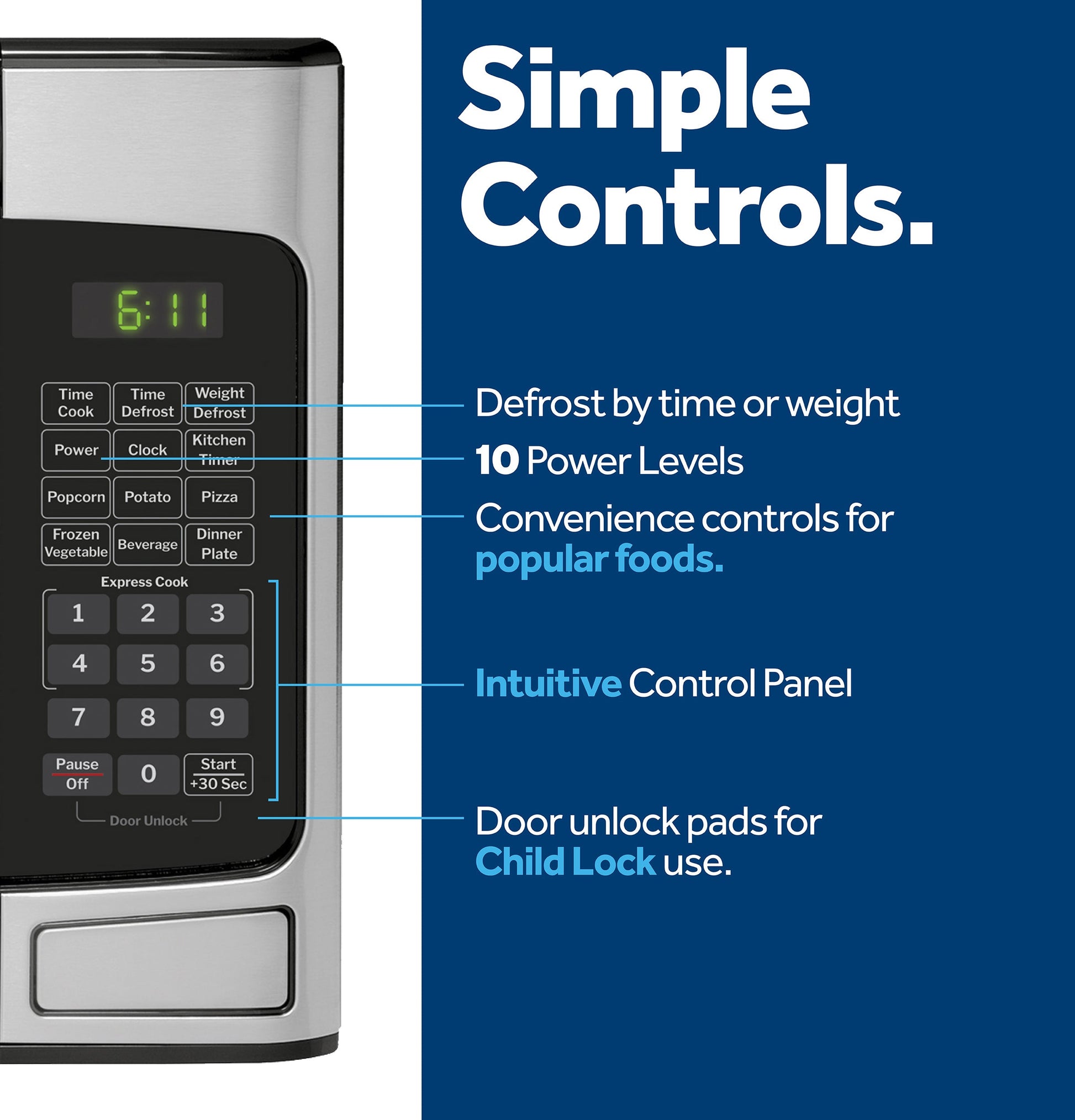 Display Type LED Cooking System Turntable Interior Lighting Incandescent Electronic Digital Display with Clock Yes Control Features Add 30 Seconds, Cancel/Off, Child Lock-Out, Clock - 12 Hr., Cooking Complete Reminder, Kitchen Timer, Power Level, Reminder, Start, Time Cook, Weight & Time Defrost Display Screen Size (Diagonal Length) 1.67 Product Type Countertop Microwave Express Cook Instant-On Microwave Watts (IEC-705) 950 Power Levels 10 Control Type Electronic Touch, LED Turntable Glass Microwave Convenience Cooking Controls Beverage, Dinner Plate, Pizza, Popcorn, Potato, Vegetable Cooking Technology Microwave Turntable Size 12.75 APPEARANCE
