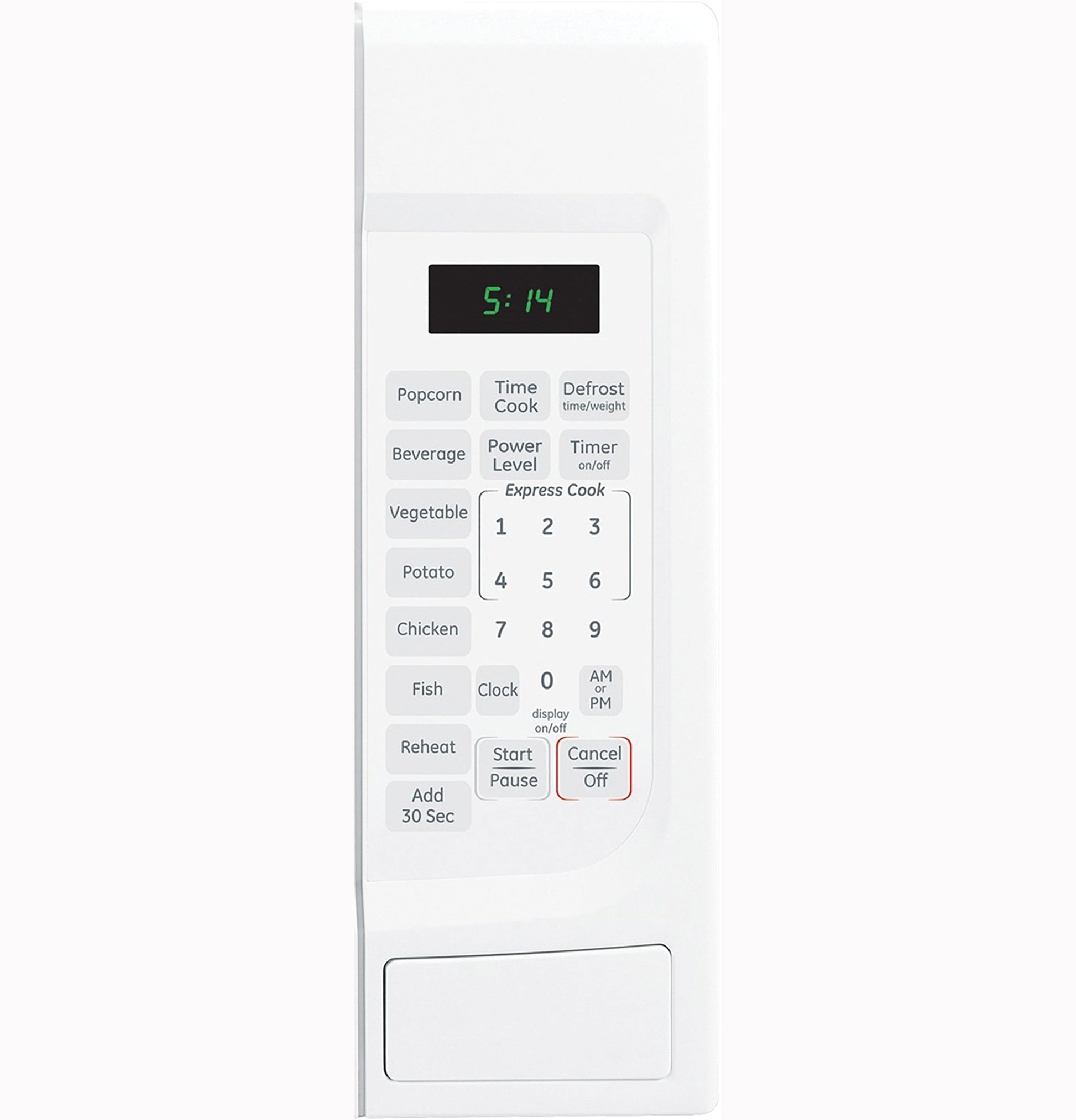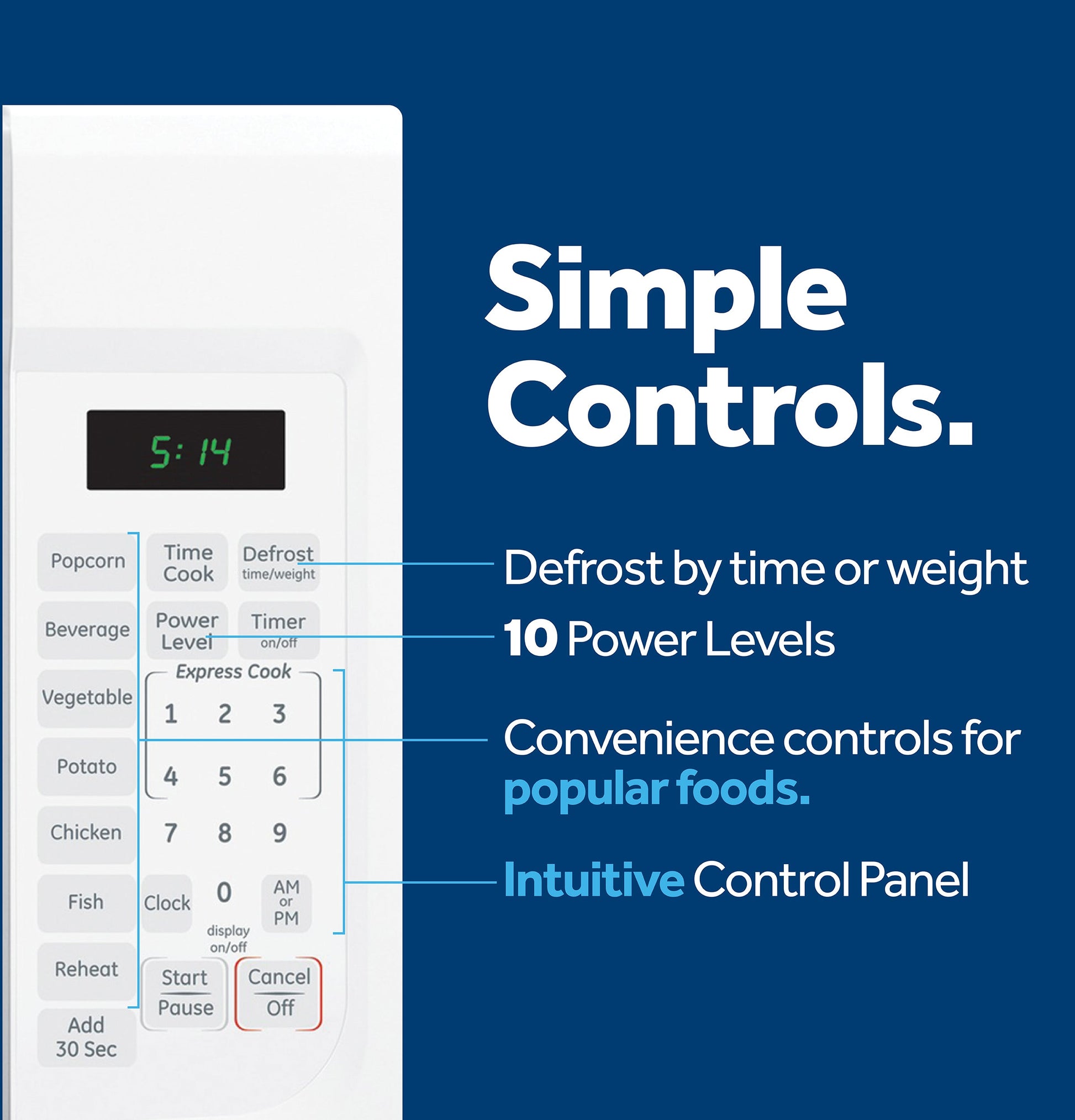 Display Type LED Cooking System Turntable Interior Lighting Incandescent Power Cord Length 36 inches Electronic Digital Display with Clock Yes Microwave Sensor Cooking Controls Beverage, Chicken, Fish, Popcorn, Potato, Vegetable Control Features Add 30 Seconds (Instant-On), Child Lock-Out, Clear/Off, Clock with AM/PM Pad, Control Lock, Cooking Complete Reminder, Display On/Off, Express Cook - Instant-On 1-6 Minutes, Start/Pause, Time Cook I & II, Timer On/Off, Weight & Time Defrost Display Screen Size (Diagonal Length) 2.01 Product Type Countertop Microwave Microwave Watts (IEC-705) 1100 Power Levels 10 Control Type Electronic Microwave Touch Controls, LED Turntable Recessed Instant On Controls 1-6 Minutes Cooking Technology Microwave Turntable Size 12.625 APPEARANCE