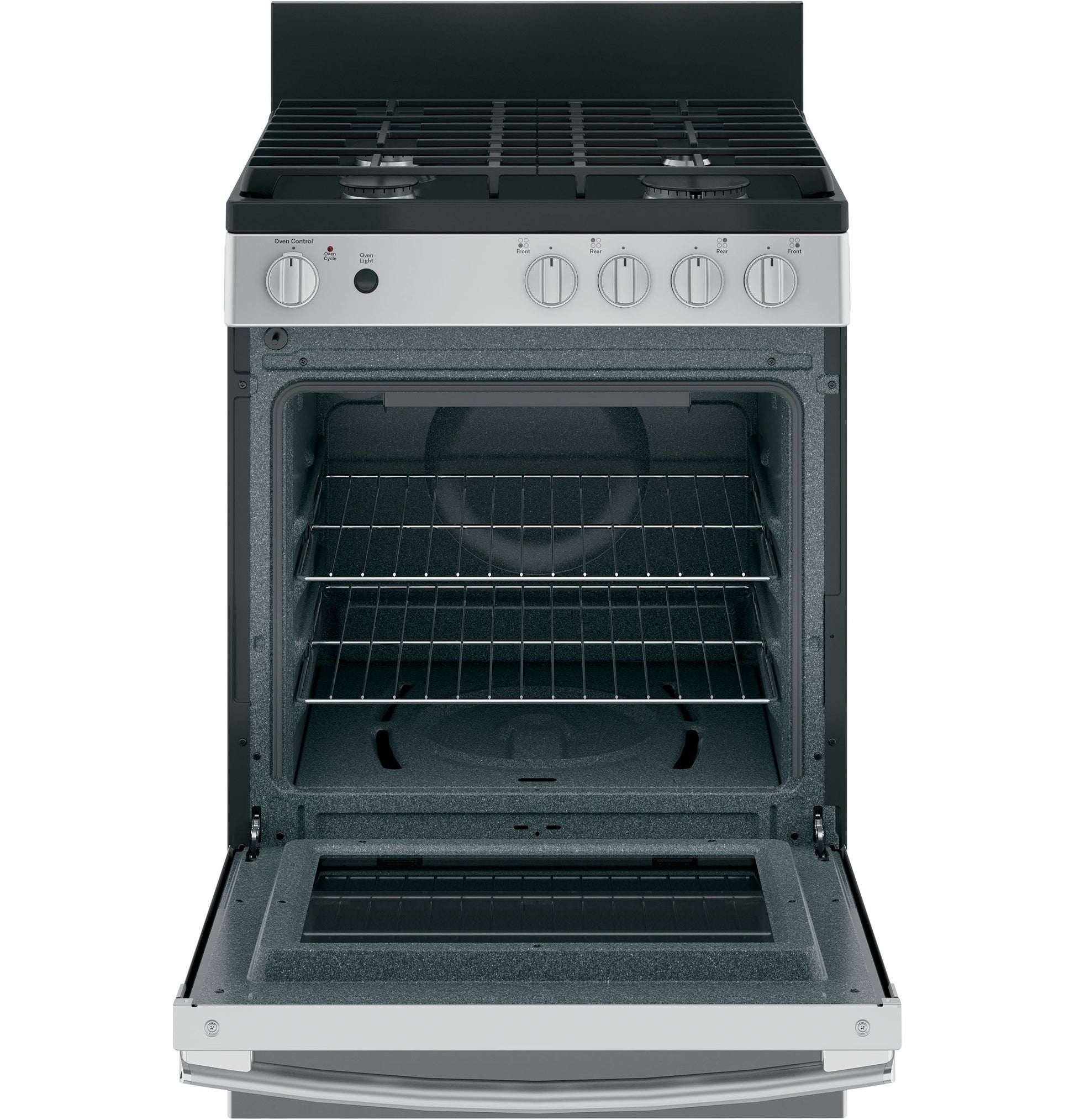 Ignition System Electronic Burner - Right Rear 5,000 BTU Oven Interior 1 Incandescent Light, Blue Gray Oven Rack Features 2 Flat Nickel Racks, 4 Rack Positions Burner - Left Rear 9,500 BTU Oven Cleaning Type Standard Clean Product Type Free-Standing Single Oven Cooktop Type Standard Grates Cooktop Burner Grate Material Cast-Iron Fuel Type Natural Gas (factory set) Control Location Front Burner - Left Front 9,500 BTU Sabbath Mode Yes Leveling System 4 Leveling Legs Cooking Technology Traditional Configuration Range with In Oven Broil OU Certified No Oven Cooking Modes Bake, Broil Cooktop Burner Type Sealed Valves (Degree of Turn) 270 Burner - Right Front 15,000 BTU Cooktop Surface Porcelain-Enamel APPEARANCE