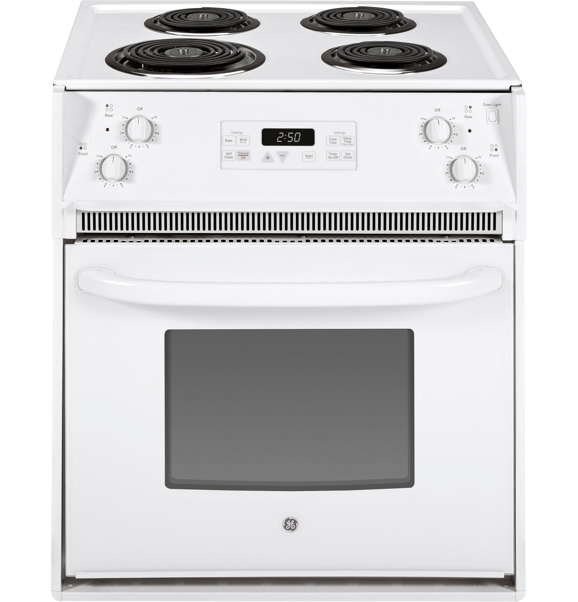 Oven Interior Gray Oven Control Features Audible Preheat Signal, Auto Oven Shut-Off, Delay Bake Option (Time Bake), Electronic Clock and Timer Oven Rack Features 2 Oven Racks, 4 Rack Positions Element - Left Front 8" 2400W 5-turn Oven Cleaning Type Self-Clean Product Type Drop-In Heating Element "ON" Indicator Light Yes Cooktop Type Coil Fuel Type Electric Element - Right Front 6" 1250W 4-turn Interior Oven Light 1 Incandescent Control Location Front Control Type Digital Temperature Display, Electronic, Touchpads Element - Left Rear 6" 1250W 4-turn Cooking Technology Traditional Oven Features 4-Pass Bake Element, 4-Pass Broil Element Removable One-Piece Drip Bowls Chrome Cooktop Burner Type Coil Element - Right Rear 6" 1250W 4-turn Cooktop Surface Lift-Up Overhanging Cooktop Porcelain Enamel Self-Clean Oven Door Lock Automatic APPEARANCE