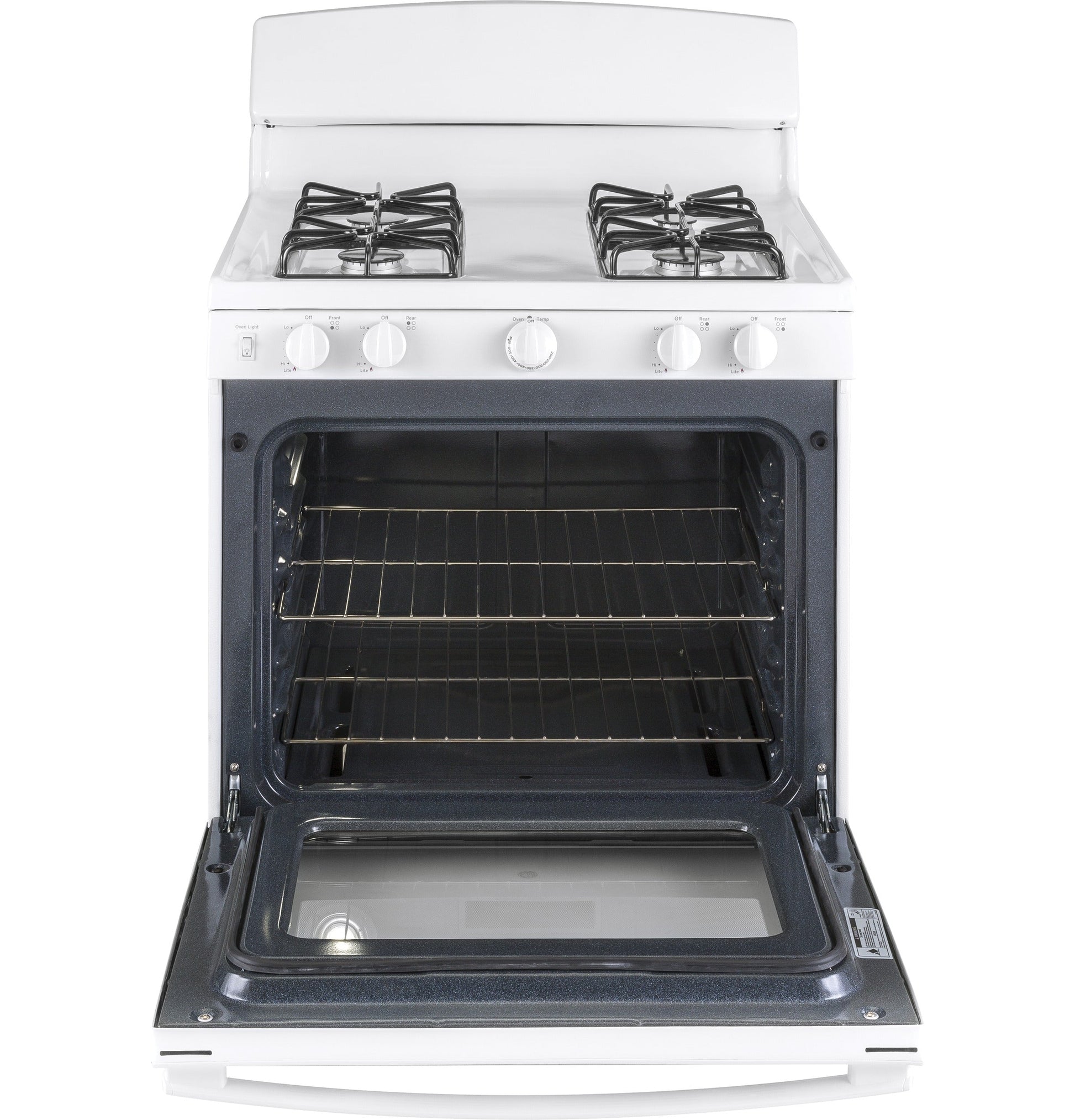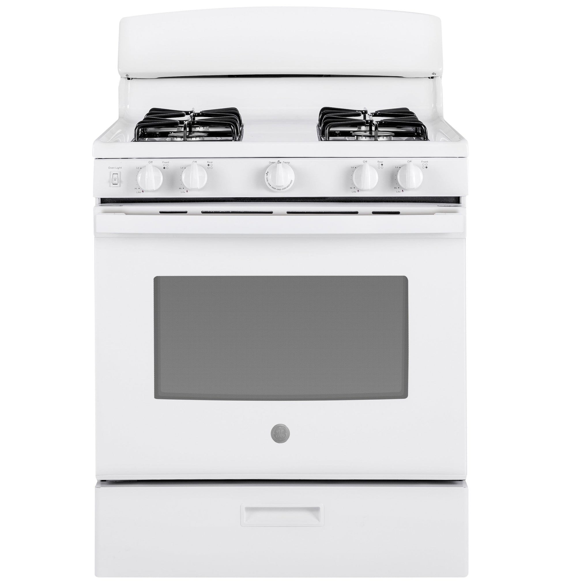 Ignition System Electronic Burner - Right Rear 5,000 BTU Oven Rack Features 2 Flat Nickel Racks, 6 Rack Positions Burner - Left Rear 9,500 BTU Oven Cleaning Type Standard Clean Product Type Free-Standing Single Oven Cooktop Type Standard Grates Cooktop Burner Grate Material Heavy Steel Fuel Type Natural Gas (factory set) Interior Oven Light 1 Incandescent Control Location Front Control Type Knob Burner - Left Front 9,500 BTU Drawer Type Broiler Sabbath Mode Yes Cooking Technology Traditional Configuration Range with Broiler Drawer OU Certified No Cooktop Burner Type Sealed Burner - Right Front 13,000 BTU Cooktop Surface One-Piece Upswept, Porcelain-Enamel, White APPEARANCE