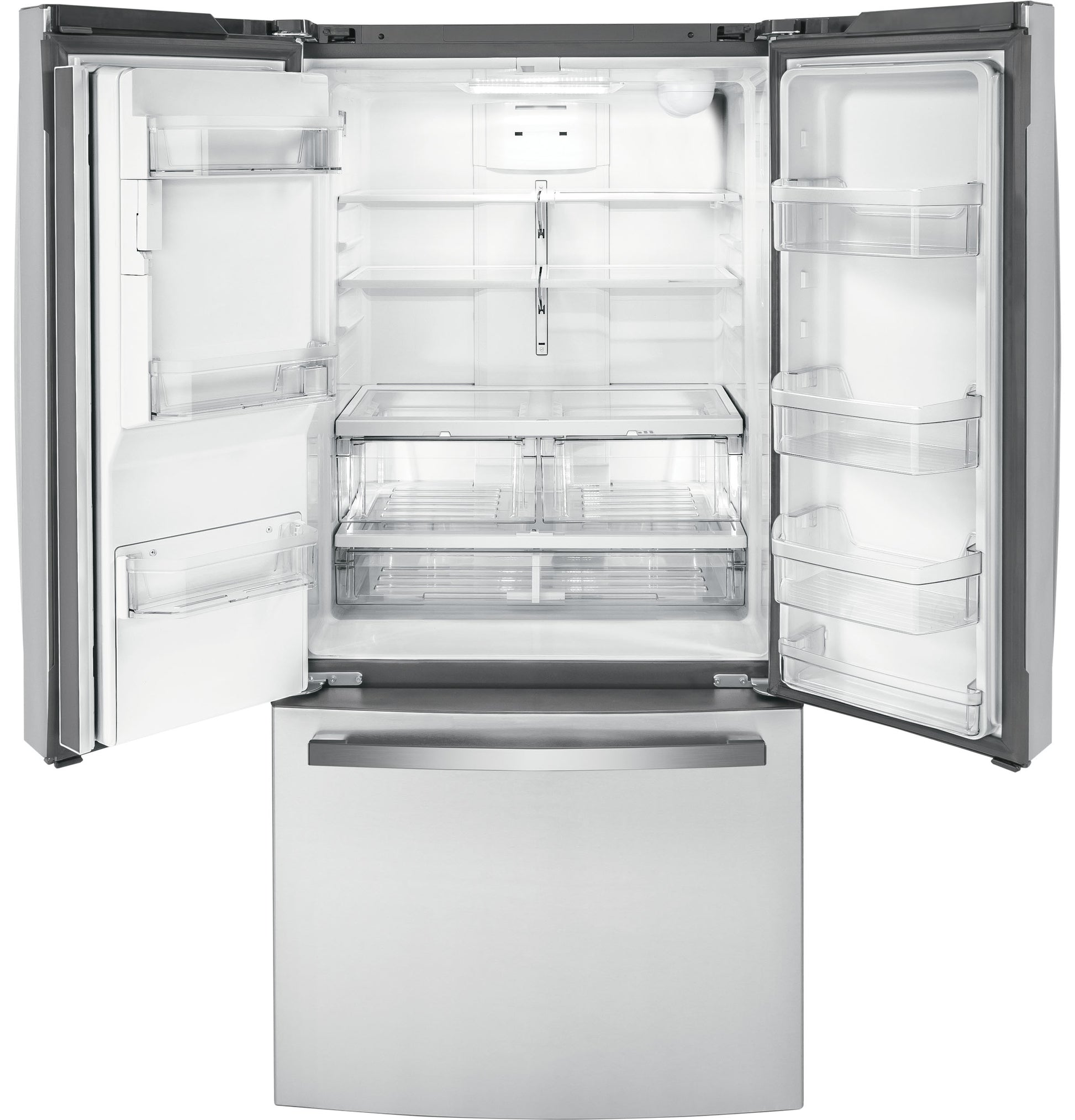 Temperature Management Features Multiflow Air System with Electronic Sensors, Turbo Cool setting Dispenser Features LED Dispenser Light, Water Filter Indicator Light Control Type Digital Temperature Display, External Electronic Temperature Controls Icemaker Factory-Installed Performance Features Easily Removable Door Gaskets Sabbath Mode Optional Filter Location Upper right corner Door Alarm Yes Freezer Storage Baskets 1 Full-Width, Full-Extension Plastic, 2 Total Defrost Type Frost Guard Leveling System 2 Point Front Adjustable Fresh Food Cabinet Shelves 1 Quick Space Shelf, 4 Split Adjustable, 5 Total, Glass Fresh Food Door Bins 3 Adjustable with Gallon Storage, 4 Fixed, 7 Clear Look Freezer Features Interior Lighting - LED Exterior Style Counter-Depth Configuration French Door Door Liner HIPS Dispenser Cubes, Crushed Ice and Chilled Water, External Water Fresh Food Features Fresh Food Cabinet Drawers 1 Full-Width, Adjustable Temperature Drawer, 2 Humidity Controlled Drawers, Multi-Level Drawers Water Filtration GE Water Filtration (XWFE Filter), Water Filter Indicator Light Product Type Bottom Freezer Refrigerator, Counter Depth Refrigerator, French-Door Refrigerator OU Certified OU/CRC Enhanced Shabbos Mode, when used with Shabbos Keeper, sold separately APPEARANCE