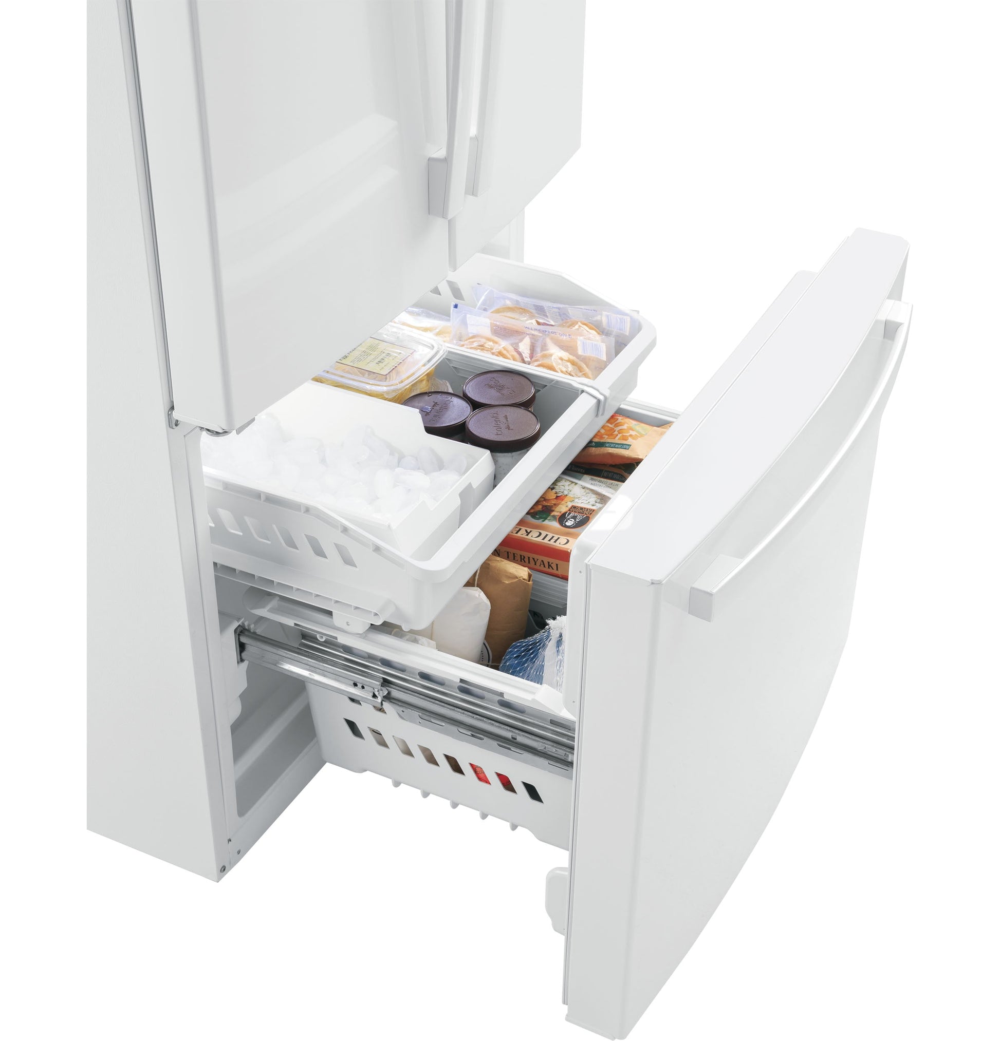 Temperature Management Features Multiflow Air System with Electronic Sensors, Turbo Cool setting Control Type Digital Temperature Display, Upfront Electronic Temperature Controls Icemaker Factory-Installed WiFi Connect Optional (Requires part no. PBX23W00Y0) Performance Features Easily Removable Door Gaskets Sabbath Mode Optional Filter Location Upper right corner Door Alarm Yes Freezer Storage Baskets 1 Full-Width, Full-Extension Plastic, 2 Total Freezer Cabinet Drawer Features Freezer Drawer Defrost Type Frost Guard Leveling System 2 Point Front Adjustable Fresh Food Cabinet Shelves 1 Quick Space Shelf, 4 Split Adjustable, 5 Total, Glass Fresh Food Door Bins 2 Fixed, 6 Adjustable with Gallon Storage, 8 Clear Look Freezer Features Ice Bucket, Interior Lighting - LED Exterior Style Counter-Depth Configuration French Door Refrigerant Type R600a Door Liner HIPS Dispenser Internal Water Fresh Food Features Fresh Food Cabinet Drawers 1 Full-Width, Adjustable Temperature Drawer, 2 Humidity Controlled Drawers, Multi-Level Drawers Water Filtration GE Water Filtration (XWFE Filter), Water Filter Indicator Light Product Type Bottom Freezer Refrigerator, Counter Depth Refrigerator, French-Door Refrigerator OU Certified OU/CRC Enhanced Shabbos Mode, when used with Shabbos Keeper, sold separately APPEARANCE