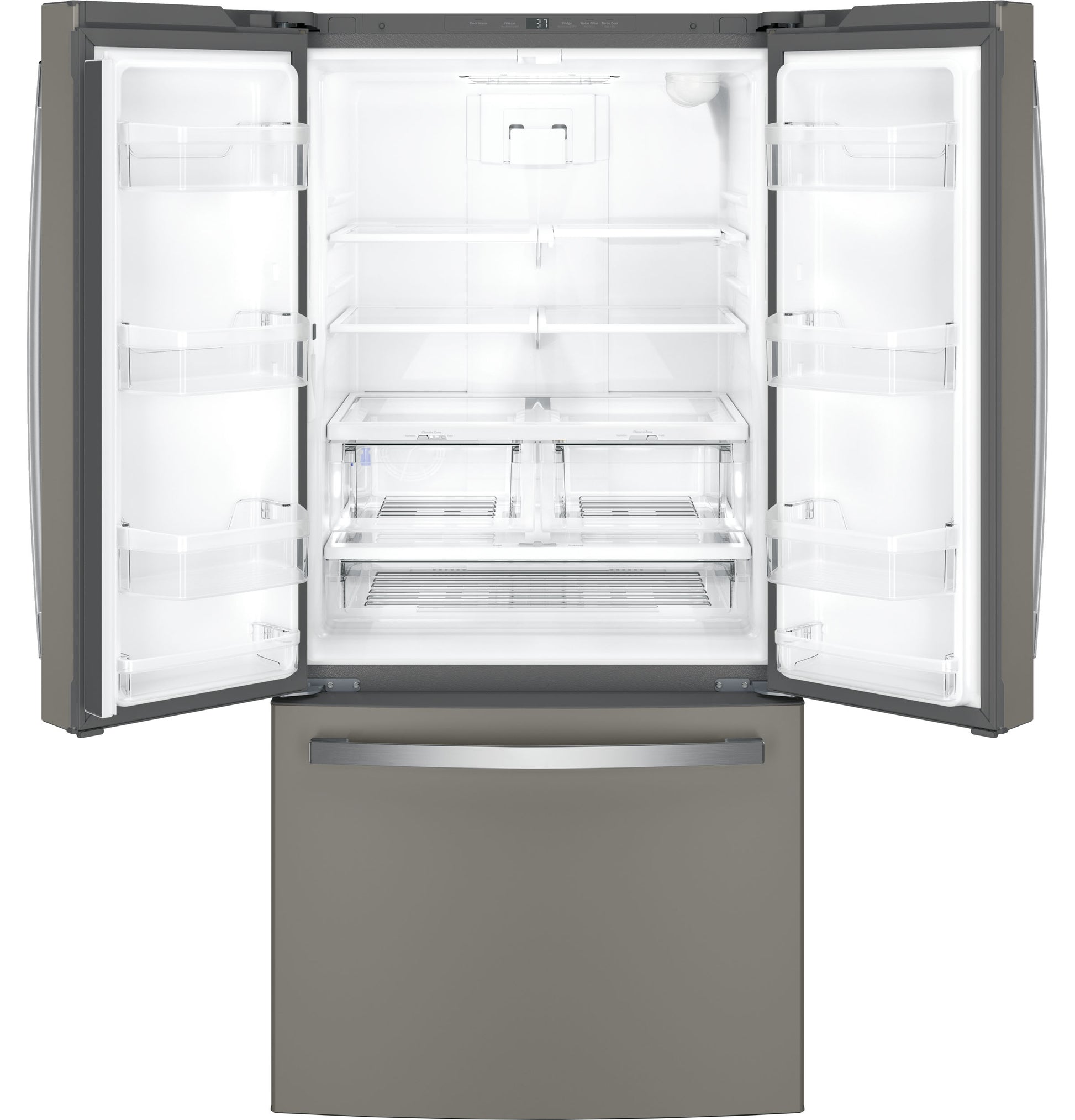 Temperature Management Features Multiflow Air System with Electronic Sensors, Turbo Cool setting Control Type Digital Temperature Display, Upfront Electronic Temperature Controls Icemaker Factory-Installed WiFi Connect Optional (Requires part no. PBX23W00Y0) Performance Features Easily Removable Door Gaskets Sabbath Mode Optional Filter Location Upper right corner Door Alarm Yes Freezer Storage Baskets 1 Full-Width, Full-Extension Plastic, 2 Total Freezer Cabinet Drawer Features Freezer Drawer Defrost Type Frost Guard Leveling System 2 Point Front Adjustable Fresh Food Cabinet Shelves 1 Quick Space Shelf, 4 Split Adjustable, 5 Total, Glass Fresh Food Door Bins 2 Fixed, 6 Adjustable with Gallon Storage, 8 Clear Look Freezer Features Ice Bucket, Interior Lighting - LED Exterior Style Counter-Depth Configuration French Door Refrigerant Type R600a Door Liner HIPS Dispenser Internal Water Fresh Food Features Fresh Food Cabinet Drawers 1 Full-Width, Adjustable Temperature Drawer, 2 Humidity Controlled Drawers, Multi-Level Drawers Water Filtration GE Water Filtration (XWFE Filter), Water Filter Indicator Light Product Type Bottom Freezer Refrigerator, Counter Depth Refrigerator, French-Door Refrigerator OU Certified OU/CRC Enhanced Shabbos Mode, when used with Shabbos Keeper, sold separately APPEARANCE