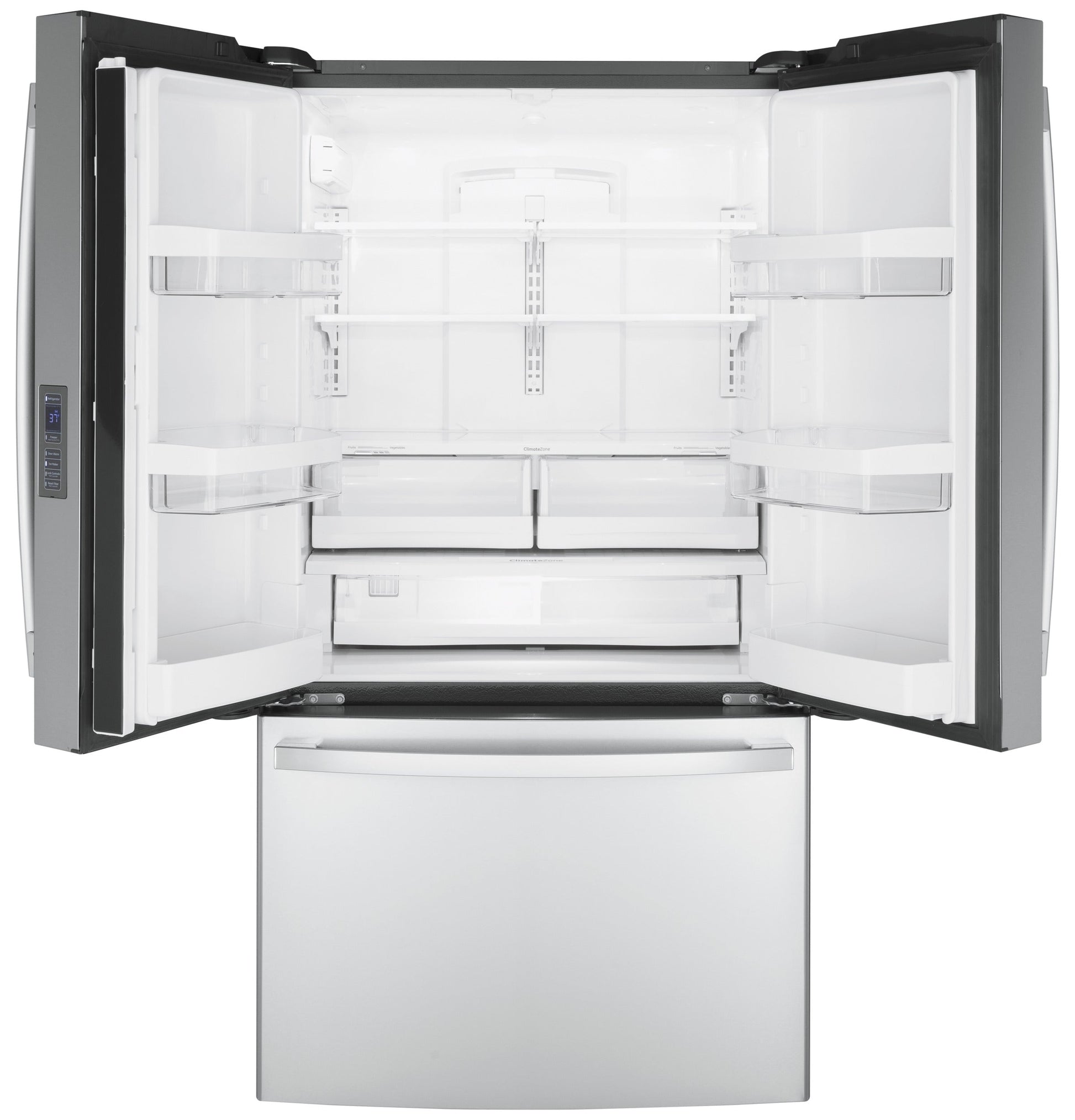 Control Type Internal Electronic Digital Temperature Display Icemaker Factory-Installed WiFi Connect Optional (Requires part no. PBX23W00Y0) Performance Features Easily Removable Door Gaskets Sabbath Mode Optional Filter Location Left wall Freezer Storage Baskets 2 Full-Width Temperature Management System TwinChill⢠Evaporators Defrost Type Frost Guard Leveling System 2 Front Leveling Legs Fresh Food Cabinet Shelves 4 Spill Proof, 4 Split Adjustable; 1 Full-Width, 5 Total - Glass Fresh Food Door Bins 4 Adjustable with Gallon Storage, 6 Total Freezer Features Interior Lighting - Showcase LED (2) Exterior Style Counter-Depth Configuration French Door Refrigerant Type R600a Dispenser Non-Dispenser Fresh Food Features Fresh Food Cabinet Drawers 1 Full-Width, 2 Adjustable Humidity, 3 Total Water Filtration Advanced Filtration System (RPWFE), Removes Pharmaceuticals Product Type Bottom Freezer Refrigerator, Counter Depth Refrigerator, French-Door Refrigerator OU Certified OU/CRC Enhanced Shabbos Mode, when used with Shabbos Keeper, sold separately APPEARANCE