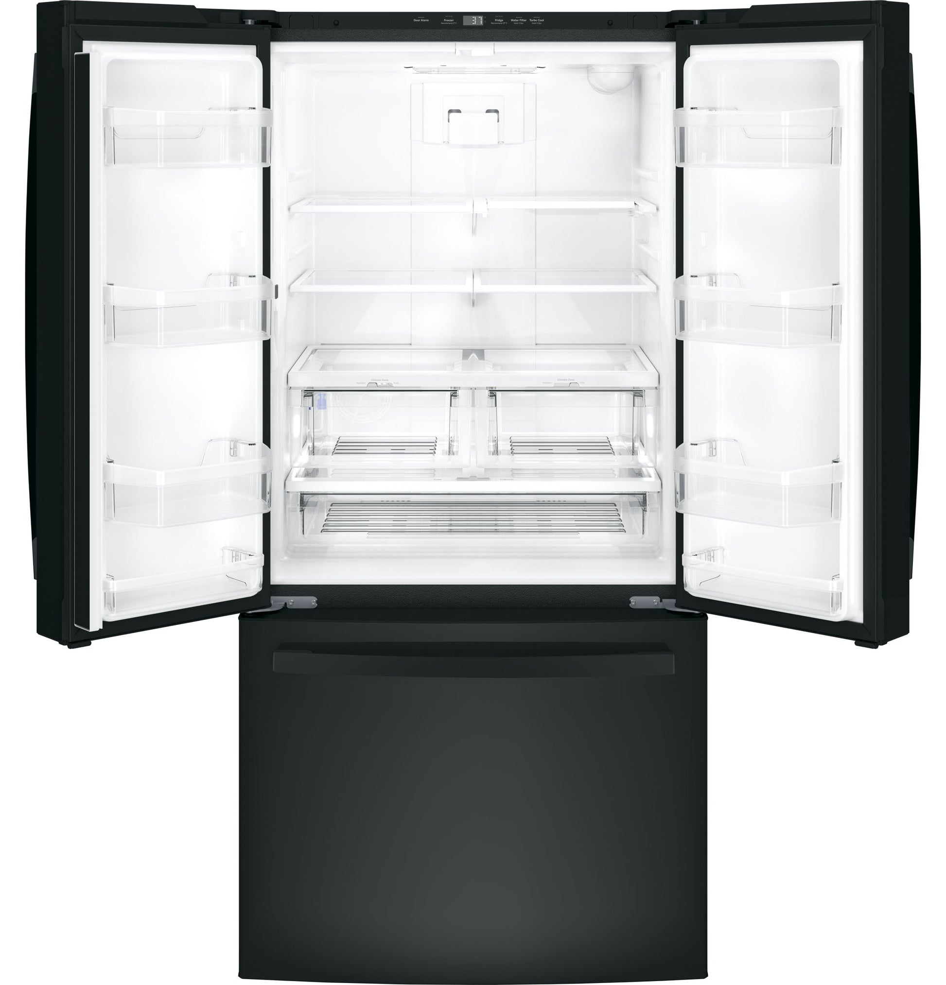Temperature Management Features Multiflow Air System with Electronic Sensors, Turbo Cool setting Control Type Digital Temperature Display, Upfront Electronic Temperature Controls Icemaker Factory-Installed Performance Features Easily Removable Door Gaskets Sabbath Mode Optional Filter Location Upper right corner Door Alarm Yes Freezer Storage Baskets 1 Full-Width, Full-Extension Plastic, 2 Total Freezer Cabinet Drawer Features Freezer Drawer Defrost Type Frost Guard Leveling System 2 Point Front Adjustable Fresh Food Cabinet Shelves 1 Quick Space Shelf, 4 Split Adjustable, 5 Total, Glass Fresh Food Door Bins 2 Fixed, 6 Adjustable with Gallon Storage, 8 Clear Look Freezer Features Ice Bucket, Interior Lighting - LED Exterior Style Free-Standing Configuration French Door Refrigerant Type R600a Door Liner HIPS Dispenser Internal Water Fresh Food Features Fresh Food Cabinet Drawers 1 Full-Width, Adjustable Temperature Drawer, 2 Humidity Controlled Drawers, Multi-Level Drawers Water Filtration GE Water Filtration (XWFE Filter), Water Filter Indicator Light Product Type Bottom Freezer Refrigerator, French-Door Refrigerator OU Certified OU/CRC Enhanced Shabbos Mode, when used with Shabbos Keeper, sold separately APPEARANCE