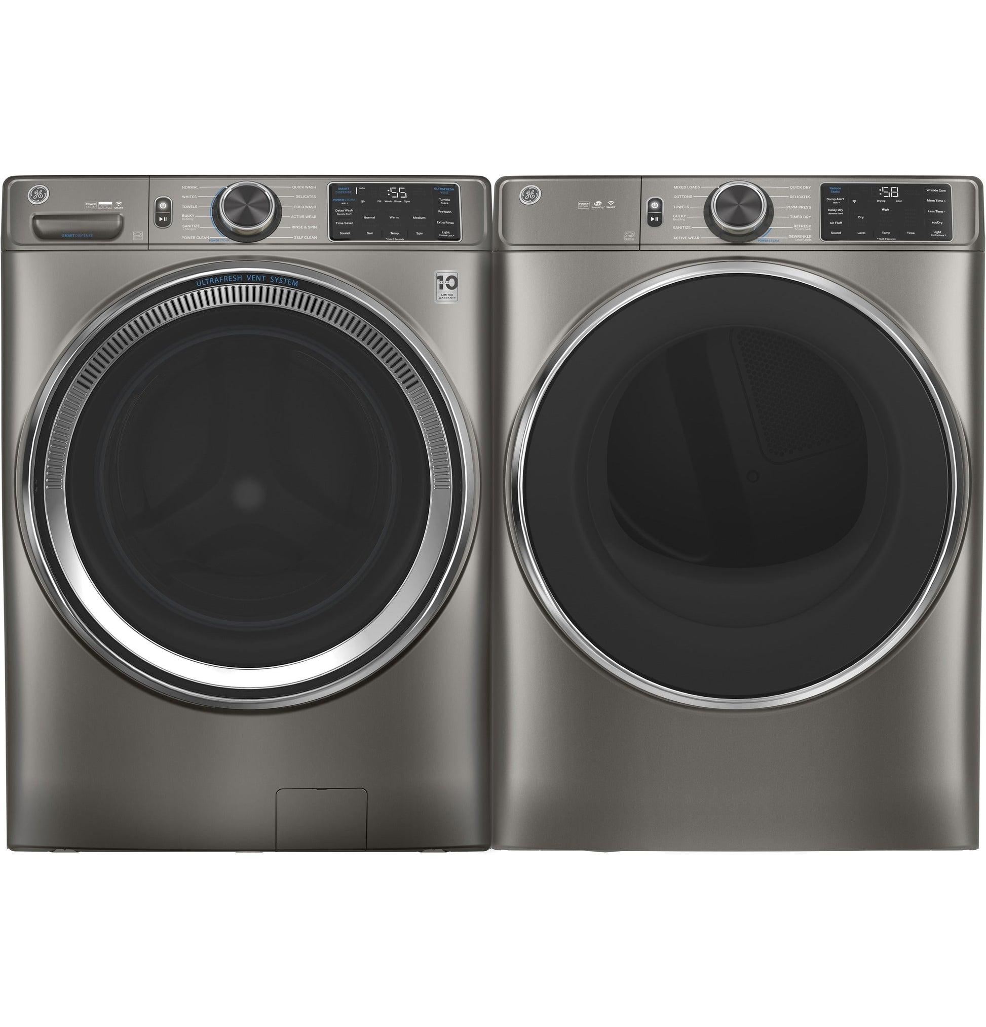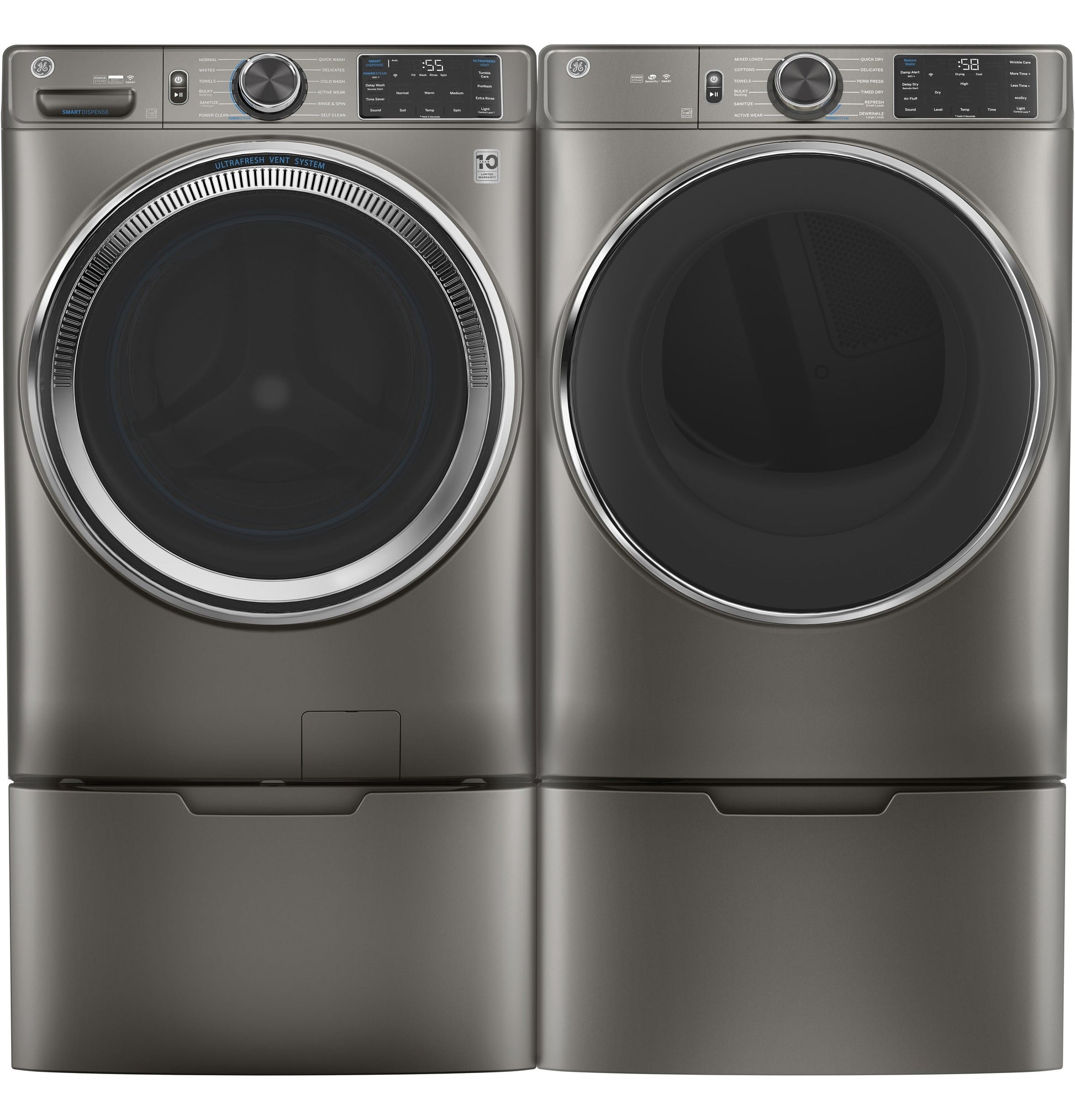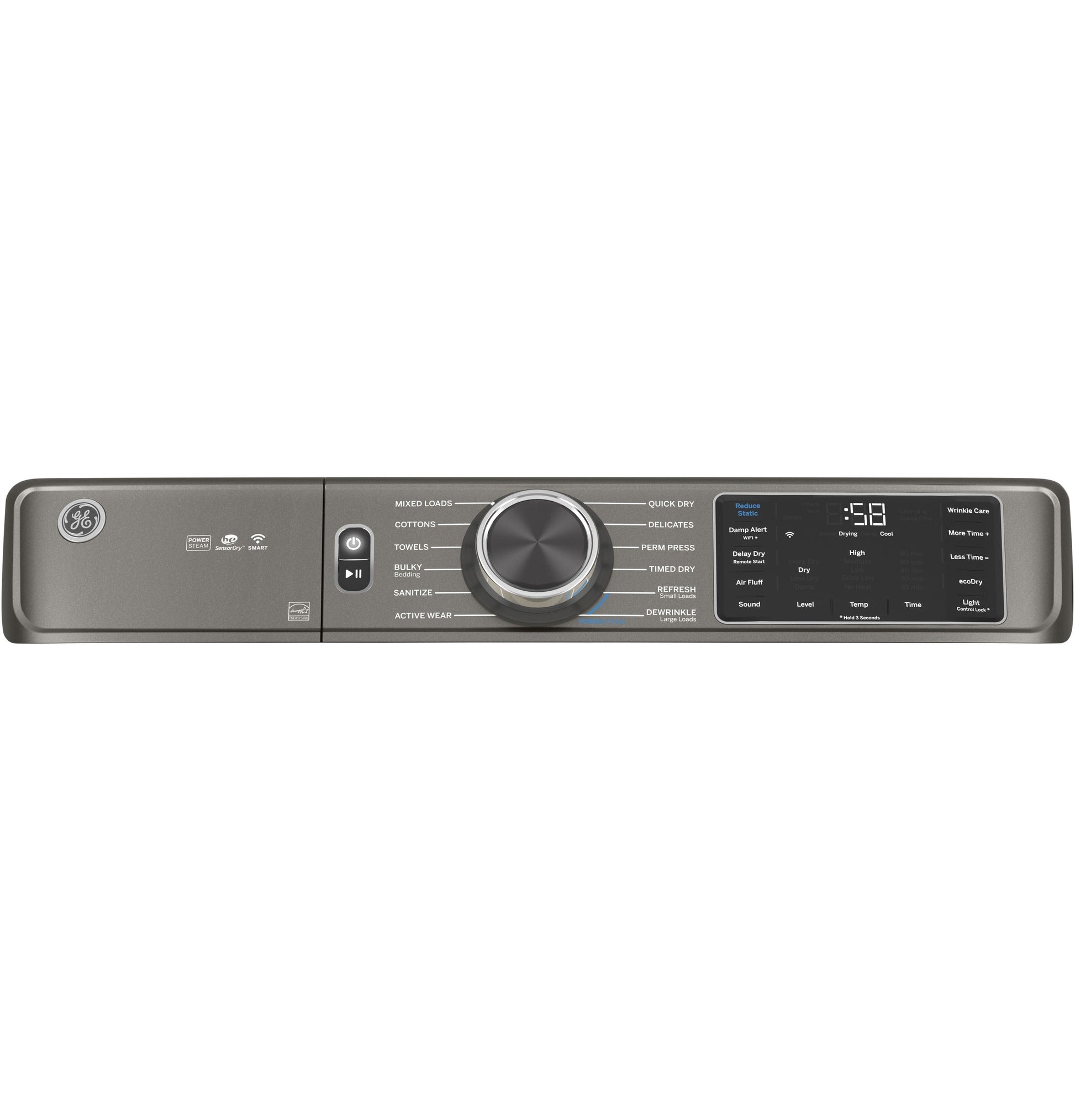 Reverse-a-Door Yes Additional Dryer Features Damp Alert, Front Serviceable, LED Interior Light, Removable Up-Front Lint Filter, Vent Sensing, Y-connector, short and long steam hoses included, ecoDry Wrinkle Care Cycle Yes Dual Thermistors Yes Dryness Levels Damp, Dry, Extra Dry, Less Dry, More Dry Drum Type Alcosta Aluminized Drum Front Serviceable Yes Additional Cycles Air Fluff, Delay Dry - up to 24 hours, EcoDry, Reduce Static, Remote Start, Sanitize, Steam Dewrinkle, Steam Refresh Steam Dewrinkle Yes Pedestal Optional Fuel Type Gas Additional Optional Cycles Damp Alert, Wrinkle Care Moisture Sensor Sensor Dry Steam Yes Dryer Cycles Active Wear, Bulky / Bedding, Cottons, Delicates, Mixed Loads, Perm Press, Quick Dry, Sanitize, Steam Dewrinkle, Steam Refresh, Timed Dry, Towels Temperature Options High/Medium/Low/Extra Low/No Heat Number of Cycles 12 Product Type Front Load Matching, Stackable Connected Capabilities Amazon Alexa, Google Home, IFTTT, Sonos, The Google Assistant Removable Up-Front Lint Filter Yes with reminder light Timed Dry 120 Minutes, Less Time -, More Time +, Presets (10,20,40,60,90) Heat Selections 5 Style Front-Loading Control Type Capacitive Touch, Power On/Off, Rotary-Electronic w/LEDs, Start/Pause Flexible Installation Undercounter, Stacked, Side-by-Side, Built-In SteamRefresh Dryer Control Features Adjustable End-of-Cycle Signal, Control Lock, Delay Dry - Up to 24 hours, Digital Cycle Countdown, LED Display, LED Indicators, Remote Start Energy Saving Option Yes - Eco Dry Exhaust Options 4-Way (Rear; Right; Left & Bottom) WiFi Connect Built-In Leveling System Adjustable Leveling Legs APPEARANCE