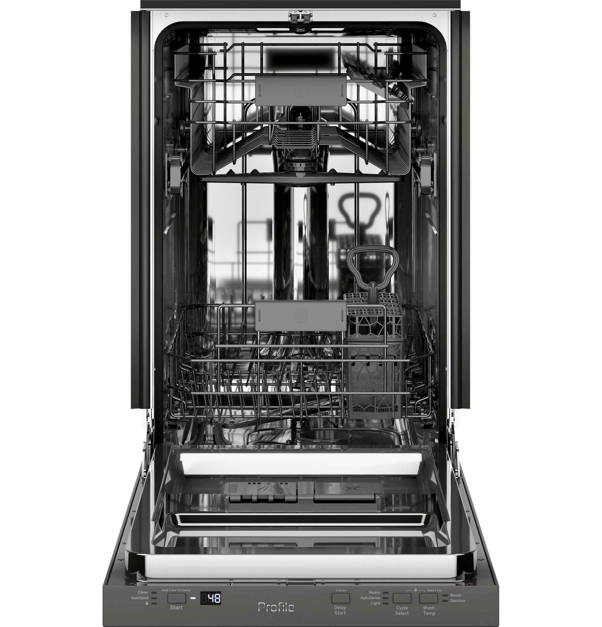 Wash System 3-Level, Standard Sensor Clean Sensor Lower Rack 1 Rack handle, Nylon Leveling System Leveling Legs Number of Place Settings Up to 8 Dishwasher Options Child Lock, Delay Start 1-12 Hr., Sani (Certified to NSF Standard 184), Start/Reset, TempBoost Latch Center Pull Number of Options 5 Style Built-In Top Control Spacemaker Water Filtration System 3-Stage Manual Clean Filtration Rack Features 1 Piece Mid Silverware Basket w/ 1 Cell Cover, 1 Plastic Utility Shelf - Upper, Ball-Tipped Tines, Fold-Down Tines - Lower, Stem Safe Dishwasher Cycles AutoSense, Heavy Wash, Light Wash Dispenser Rinse Aid with Indicator and Adjustment WiFi Connect Optional (Requires part no. PBX23W00Y0) Control Type 4 Pushbuttons, Fully Integrated Electronic, Top Controls Racking System Gray Dishwasher Drying Features Condensate Dry Wash Arms 2 with Upper Nozzle Wash System Features Automatic HotStart, Automatic Temperature Control, Dual Pump, Flood Control System, Piranha⢠Hard Food Disposer Exterior Style 18" Wide Connected Capabilities Amazon Alexa, IFTTT, Sonos, The Google Assistant Upper Rack 1 Rack handle, Adjustable, Nylon Dishwasher Control Features 3 Digit Countdown Display with 1 "Clean" light / 1 "Sanitized" light Cycle Progress Indicators, Audible End-of-Cycle Signal, Cycle Countdown, Last Cycle Memory, Start/Reset Pad Number of Cycles 3 Tub and Door Liner Stainless Steel APPEARANCE