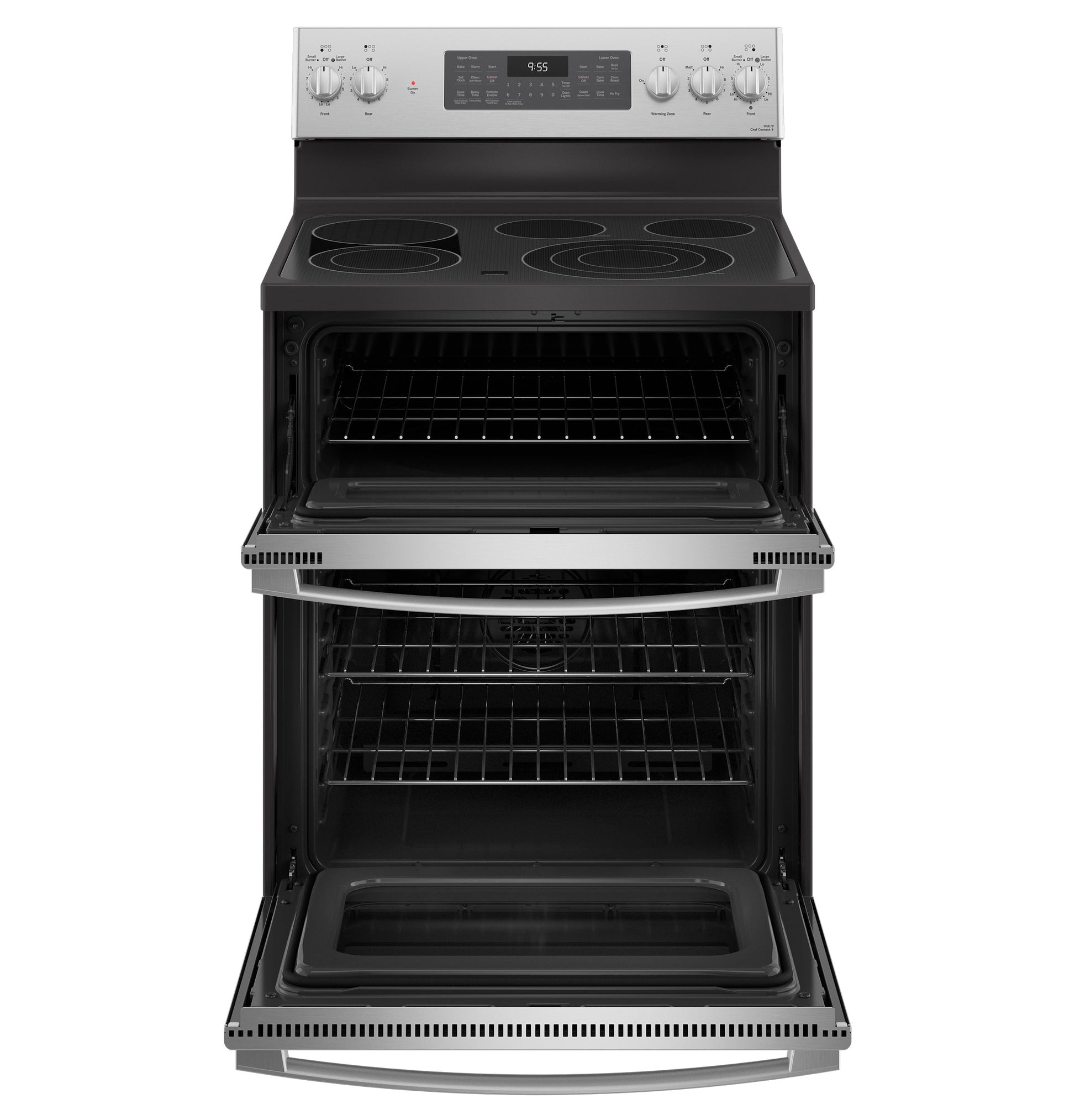 Cooking System True European Convection with Precise Air (Lower) Oven Interior 2 Incandescent Element - Center 6" 80W Warming Zone Oven Rack Features 2 Upper / 7 Lower Rack Positions, 3 Heavy Duty Oven Racks Element - Left Front 8"/5" 1900W Oven Cleaning Type Self-Clean with Steam Clean Option Connected Capabilities Amazon Alexa, DiGiorno, Fresco, IFTTT, Innit, Sonos, The Google Assistant WiFi Enabled Features Clock Sync, Remote Control, Remote Notifications, Scan To Cook (Oven) Product Type Free-Standing Double Oven Heating Element "ON" Indicator Light 5 Cooktop Type Radiant Smoothtop Fuel Type Electric Element - Right Front 12â/9â/6â 3600W Power Boil WiFi Connect Built-In Control Location Backsplash Control Type Digital Temperature Display, Electronic, Touchpads Hot Surface Indicator Lights 1 Sabbath Mode Yes Element - Left Rear 8" 2000W Cooking Technology Traditional Upper; Convection Lower Configuration Double Oven Range Oven Features 6-Pass Broil Element (Lower), 8-Pass Broil Element (Upper), Hidden Bake (Both Ovens) Range Control Features Audible Preheat Signal, Auto Oven Shut-Off with Override, Auto Recipe Conversion, Auto Self Clean, Certified Sabbath Mode, Chef Connect, Control Lock Capability, C° or F° Programmable, Delay Bake Option (Time Cook), Delay Clean Option, Electronic Clock & Kitchen Timer, Fast Preheat, Hi / Low Broil, Oven "ON" Light, Preheat Notification (Both Ovens), Self-Clean Cool Down Time Display Melt Setting Yes OU Certified No Oven Cooking Modes Bake, Broil, Convection Bake (Lower Oven), Convection Roast (Lower Oven), No Preheat Air Fry (Lower Oven), Warming (Upper Oven) Cooktop Burner Type Radiant, Smoothtop Element - Right Rear 6" 1200W Cooktop Surface Black Patterned Ceramic Glass, One-Piece Upswept APPEARANCE