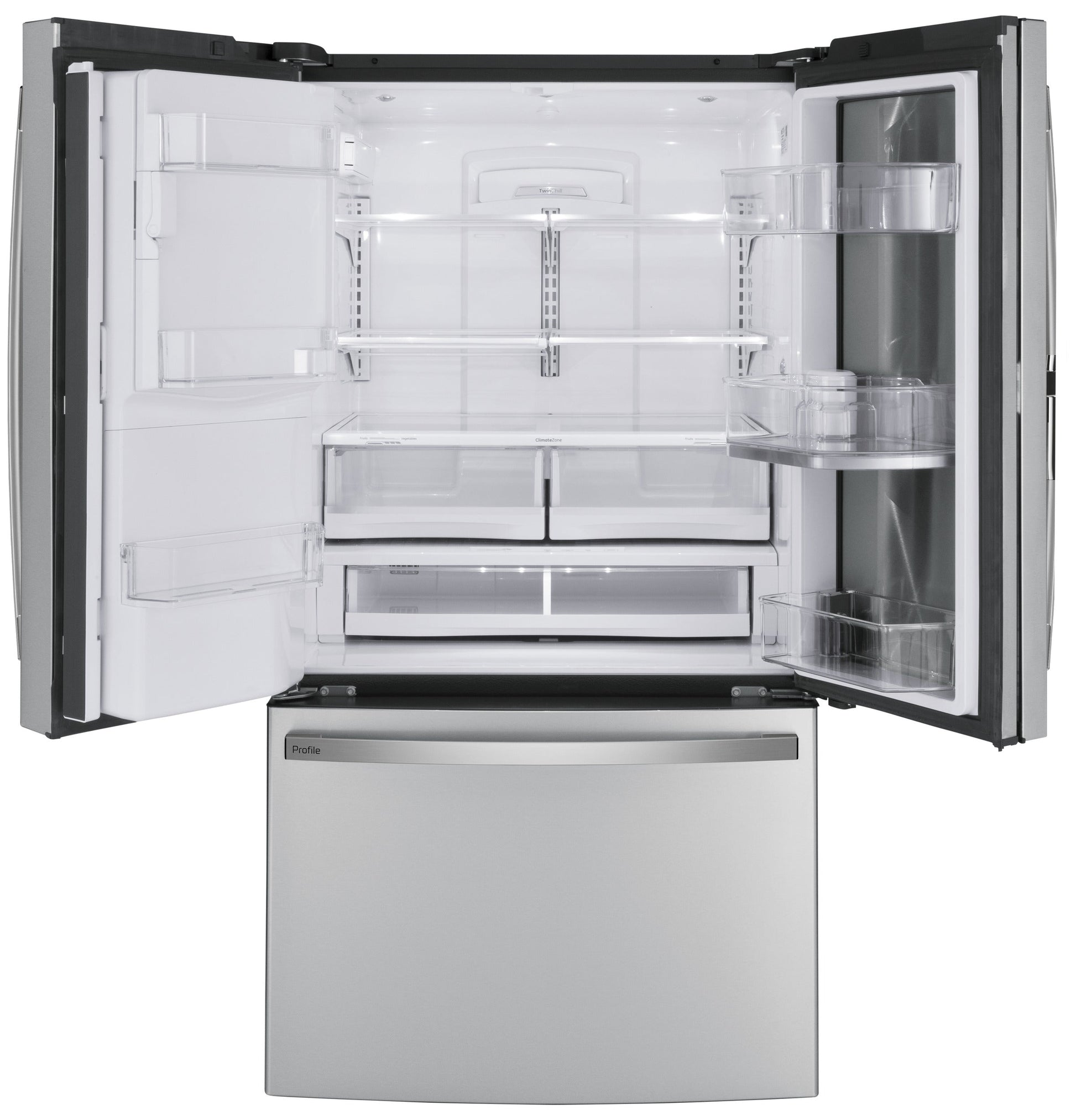 Temperature Management Features Turbo Cool setting Dispenser Features Door Alarm, Hands-Free AutoFill, LED Dispenser Light, Water Filter Indicator Light Control Type External Electronic Digital Temperature Display Icemaker Optional 2nd Icemaker (IM5D) in Freezer, Space Saving Ice WiFi Connect Optional (Requires part no. PBX23W00Y0) Performance Features Easily Removable Door Gaskets Sabbath Mode Optional Filter Location Left wall Freezer Storage Baskets 2 Full-Width Temperature Management System TwinChill⢠Evaporators Freezer Door Bins 1 Total Defrost Type Frost Guard Leveling System 2 Front Leveling Legs Fresh Food Cabinet Shelves 1 Quick Space Shelf, 3 Spill Proof, 4 Split Adjustable; 1 Full-Width, 5 Total - Glass with Silver Trim Fresh Food Door Bins 1 Rotating, 6 Total Freezer Features Interior Lighting - LED (2) Exterior Style Free-Standing Configuration Door in Door Refrigerant Type R600a Dispenser Cubes, Crushed Ice and Water, Large Color-Matched Fresh Food Features Fresh Food Cabinet Drawers 1 Full-Width, Adjustable Temperature Drawer, 2 Adjustable Humidity, 3 Total, Electronic Temperature Control w/ LED Lighting Water Filtration Advanced Filtration System (RPWFE), Removes Pharmaceuticals Product Type Bottom Freezer Refrigerator, French-Door Refrigerator OU Certified OU/CRC Enhanced Shabbos Mode, when used with Shabbos Keeper, sold separately APPEARANCE