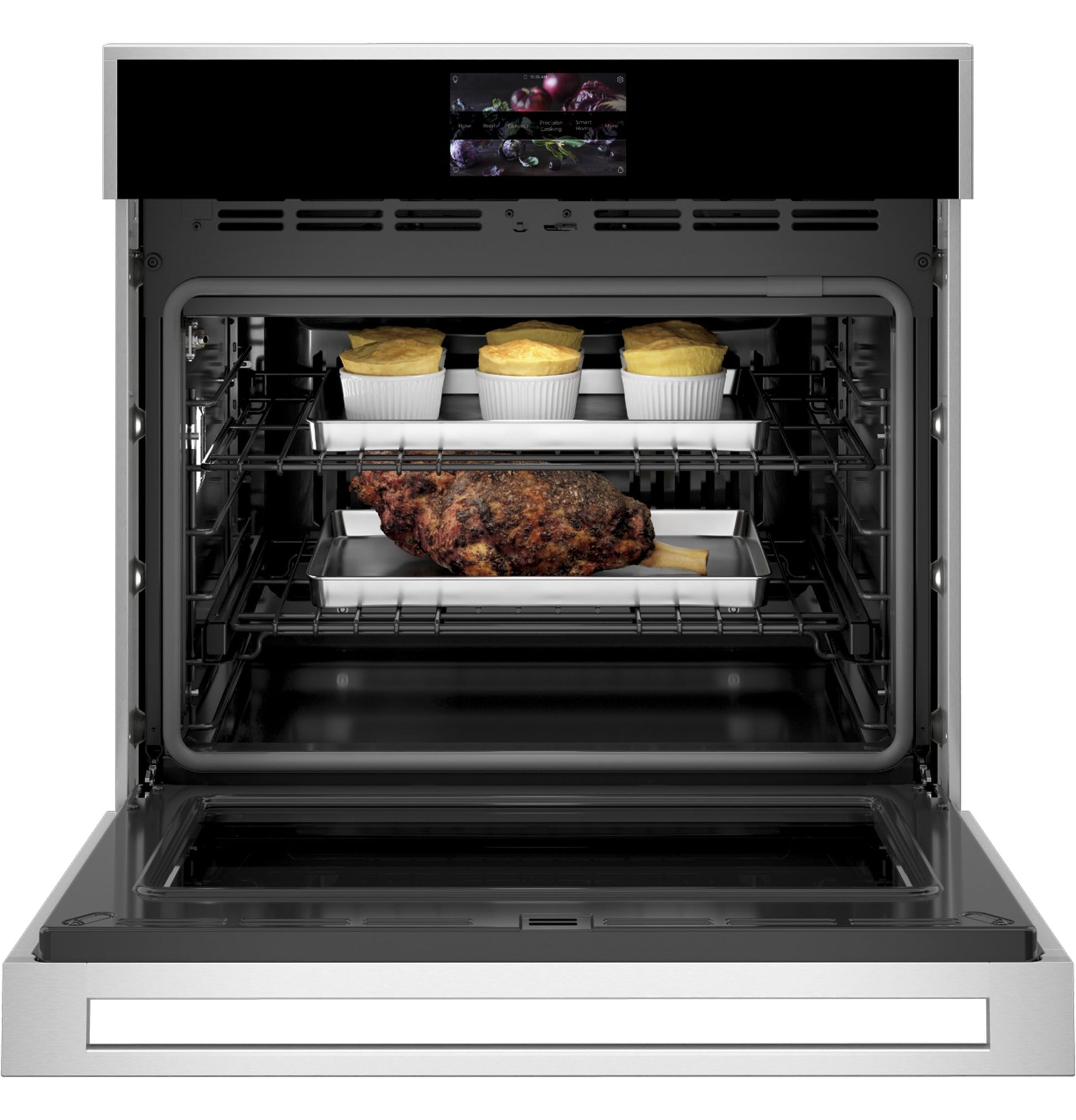 WiFi Connect Built-In Oven Cooking Modes Convection Bake, Convection Bake Multi-Rack, Convection Broil Hi/Lo, Convection Roast, Dehydrate, Keep Warm, No-Preheat Air Frying, Precision Cooking Modes, Proof, Thermal Bake, Thermal Broil Hi/Lo Fuel Type Electric Oven Interior 2 Halogen Interior Oven Lights, Black Gloss Finish, Hidden Bake Cooking Technology Convection Oven Features 10-Pass Bake Element, 10-Pass Dual Broil Element, Closed Door Broiling Cleaning Time Variable with Delay Clean Option Configuration Single Oven Oven Control Features 12-Hour Shut-Off Capability, Audible Preheat Signal, Auto Recipe Conversion, Certified Sabbath Mode, Control Lock Capability, Cook Time, C° or F° Programmable, Delay Time, Electronic Clock & Kitchen Timer, Mis-Wire Detection, Proof Mode, Remote Enabled, Scan-to-cook, Temperature Probe, Warm Mode Short Description 30" Minimalist Single Wall Oven Oven Rack Features 1 Self-Clean Heavy-Duty, Full Extension Oven Rack, 2 Self-Clean Heavy-Duty Oven Racks, 6 Ladder-Rack Positions Self-Clean Oven Door Lock Automatic Cooking System True European Convection with Direct Air, Variable Speed, Reverse Air Convection Control Type 7" Full-Color Touch LCD Screen Connected Capabilities Amazon Alexa, Fresco, IFTTT, Innit, Sonos, The Google Assistant Oven Cleaning Type Self-Clean with Steam Clean Option APPEARANCE
