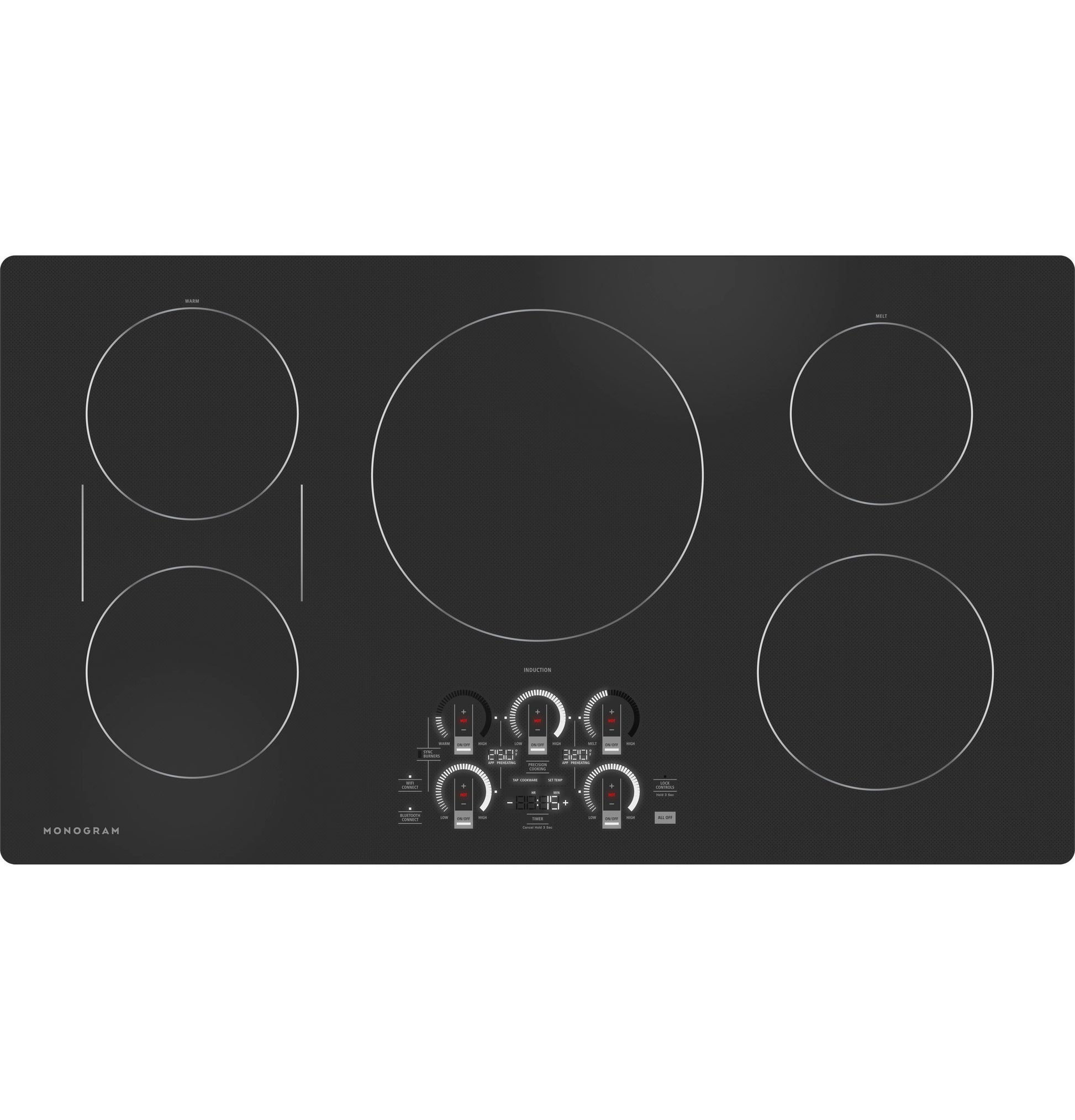WiFi Connect Built-In Cooktop Burner Type 5 Induction Elements Fuel Type Electric Style Smoothtop Element - Left Front 7" 2500W Indicator Lights 5 Hot Surface, Surface Element "ON" Short Description 36" Induction Cooktop Element - Right Front 8" 3200W Control Location Front Center Cooking Technology Induction Cooktop Type Induction Cooktop Surface Cooktop Control Features Control Lock Capability, Electronic Touch Slider, Melt Setting, Pan Presence Sensor, Pan Size Sensor, Sync-Burners Timer Kitchen timer Element - Left Rear 7" 2500W Control Type Electronic Touch Slider Element - Center 11" 3700W Element - Right Rear 6" 1800W Power Level Indicator 19 Levels APPEARANCE