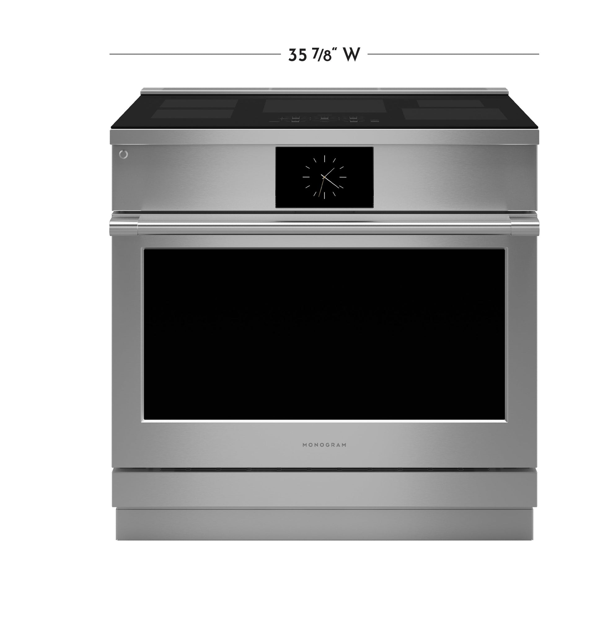 Cooking System Reverse Air Convection, True European Convection Element - Center 11" (3700W) Oven Control Features 12-Hour Shut-Off Capability,, Audible Preheat Signal,, Auto Recipe Conversion,, Control Lock Capability,, Cook Time,, C° or F° Programmable,, Delay Clean,, Delay Start,, Oven Camera,, Oven Light On/Off, Remote Enabled,, Self Clean Cycle Time,, Set Clock,, Steam Clean Cycle Time,, Temperature Probe,, Timer, Oven Rack Features 3 Self-Clean Oven Racks, Full-Extension Element - Left Front 7" (2500W) Convection Roasting Rack Yes Oven Cleaning Type Self-Clean, Steam Clean Connected Capabilities Innit WiFi Enabled Features Bluetooth Chef Connect, Interfaces with SmartHQ App Heating Element "ON" Indicator Light 5 Cooktop Type Induction Fuel Type Electric Cooktop Control Features All-Off Button, Boost, Control Lock Capability, Keep Warm, Melt Setting, Pan Presence Sensor, Pan Size Sensor, Sync-Burners Element - Right Front 8" (3200W) Interior Oven Light 6 Halogen White Light WiFi Connect Built-In Control Type 7" Touch Articulating LCD, Electronic Glide Touch-Control Lighting Customizable LED Bullnose Task Lighting (Dimmable, Color Changing) Hot Surface Indicator Lights 5 Element - Left Rear 7" (2500W) Includes Keep Warm setting Cooking Technology Convection, Induction Oven Features 8-Pass Bake Element, 8-Pass Broil Element, Hidden Bake Melt Setting Yes Oven Cooking Modes Convection Bake Multi-Rack, Convection Broil Hi/Lo, Convection Roast, Hot Air Fry, Precision Cooking Modes, Proof, Scan-to-Cook, Warming Cooktop Burner Type 5 Induction Elements Element - Right Rear 6" (1800W) Includes Melt Setting Cooktop Surface Glass Oven Rack Positions (Single or Upper/Lower) 5 Self-Clean Oven Door Lock Automatic APPEARANCE