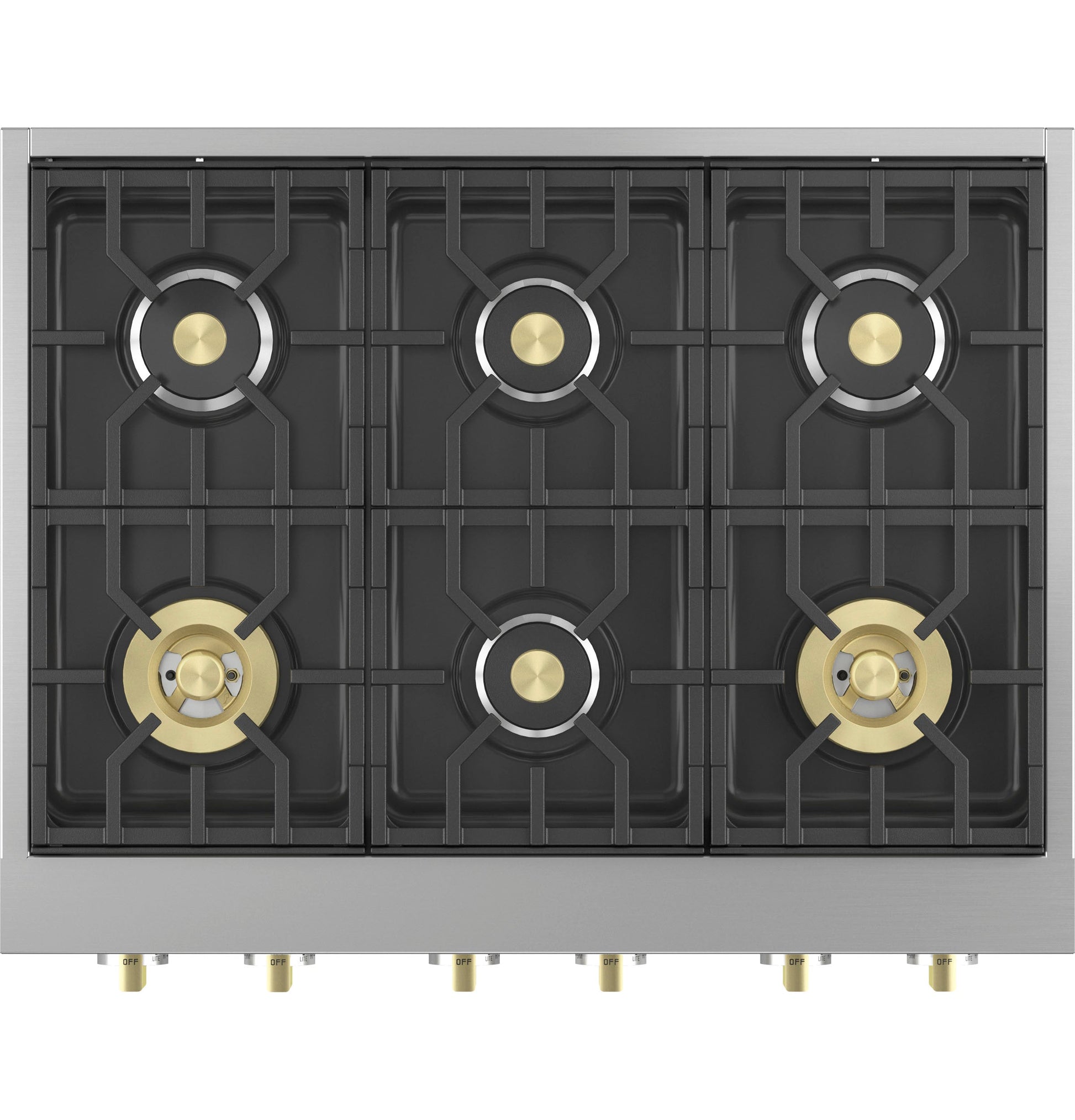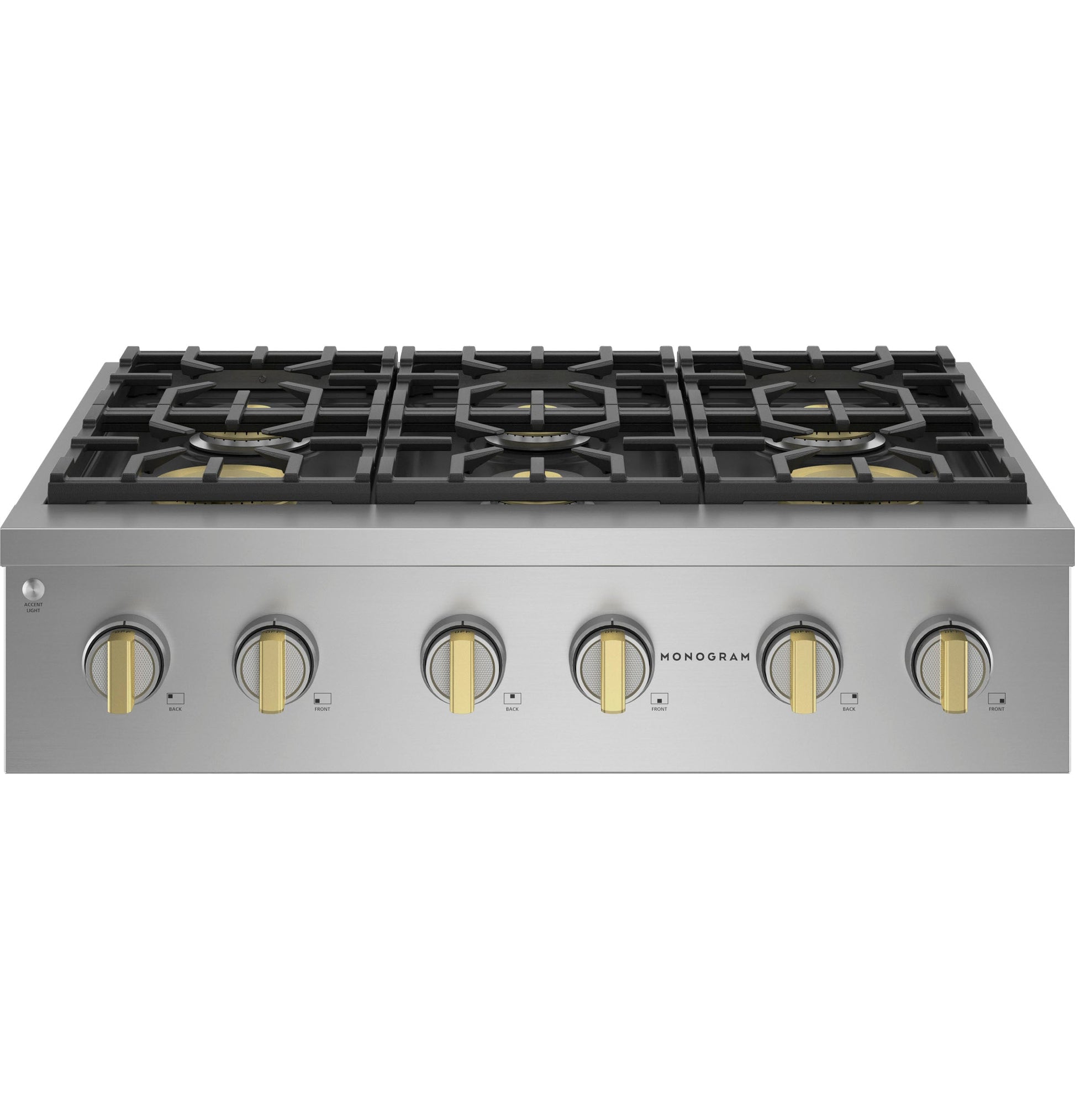 Cooktop Burner Type 2 Sealed, Dual Ring, 4 Sealed, Dual Flame Stacked (Removable Brass Accents) Fuel Type Natural Gas (factory set) Short Description 36" Pro Rangetop with 6 Burners Control Location Upfront Ignition System Electronic Lighting LED Bullnose Task Lighting Extra Low Simmer All Burners - Adjustable Burner Indicator Light Yes Automatic Re-Ignition Yes Cooktop Burner Grate Features Porcelainized Cast Iron 3-Piece Reversible (Flat/Wok) Grates 140 Deg. Simmer Burner All Burners - Adjustable Configuration 6 Burners APPEARANCE